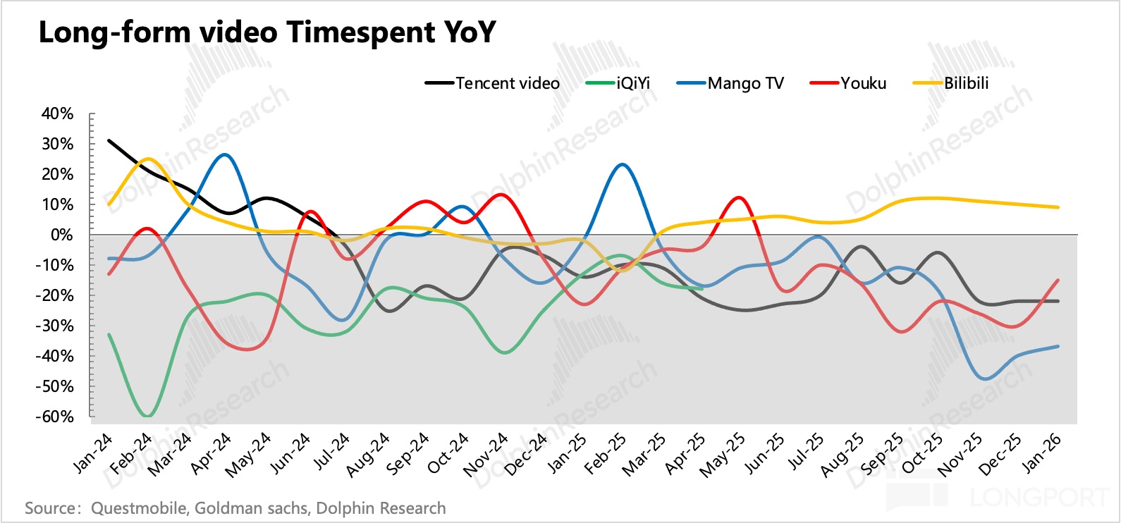 從 Questmobile 數據看,1 月 B 站用户總時長繼續增長近 9%,環比略微降速,但仍然是除了字節、小紅書之外為數不多的還能正增長的頭部平台。