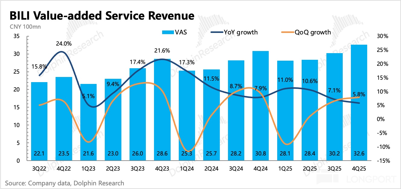 直播 + 大會員訂閲為主的 VAS 增值服務收入,四季度同比增長 5.8%,增速繼續放緩。