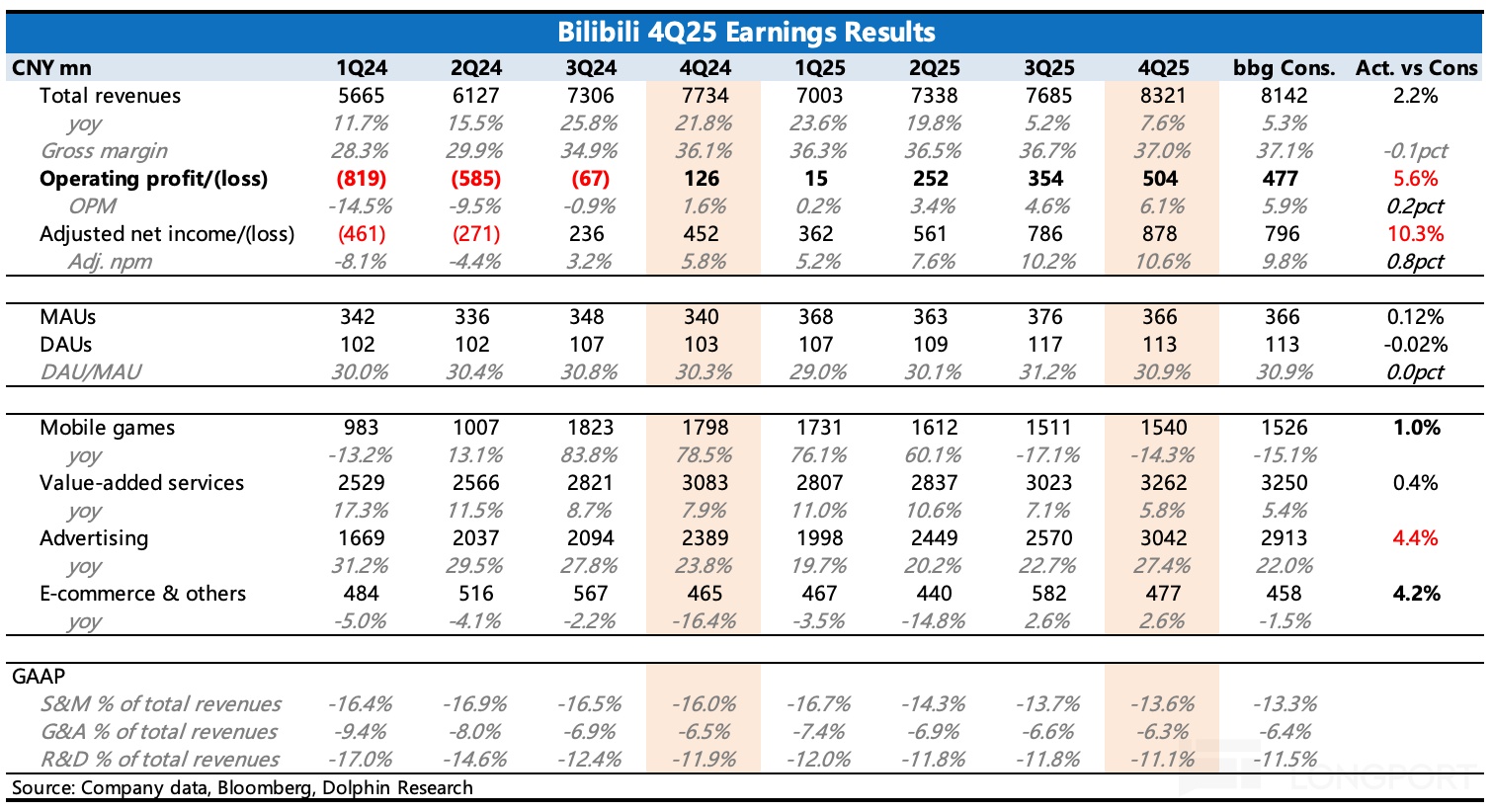 北京時間 3 月 5 日港股盤後,$嗶哩嗶哩(BILI.US) 發佈 2025 年四季度財報,亮點主要是廣告,其他業務則表現一般,基本符合預期。