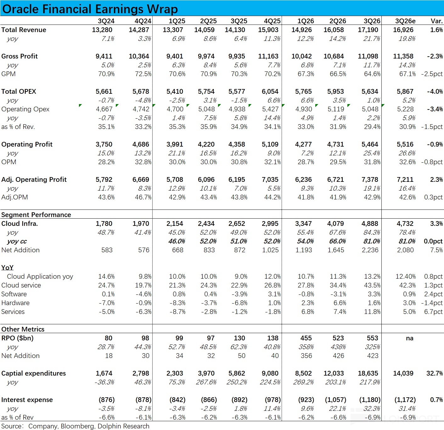 5. TikTok 股權投資:1 月 TikTok 美國完成數據業務從字節跳動的分離,甲骨文持有新公司 15% 股權並獲得董事會席位。對現有服務收入無影響;股權投資採用權益法核算,將在 FQ4 確認 1 月底至 3 月 31 日期間的損益份額(存在 2 個月滯後),計入營業外收入。