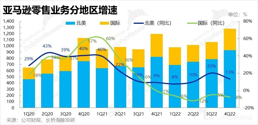 在過往明珠 AWS 持續表現不佳的同時,自 2021 下半年以來一直疲軟、市場也不報太高期待的零售板塊業務則已連續兩個季度比預期更堅挺。亞馬遜本季的雲業務以外的零售板塊實現收入 1278 億美元,同比增長了 6.8%,比市場預期高出了 3.5pct。