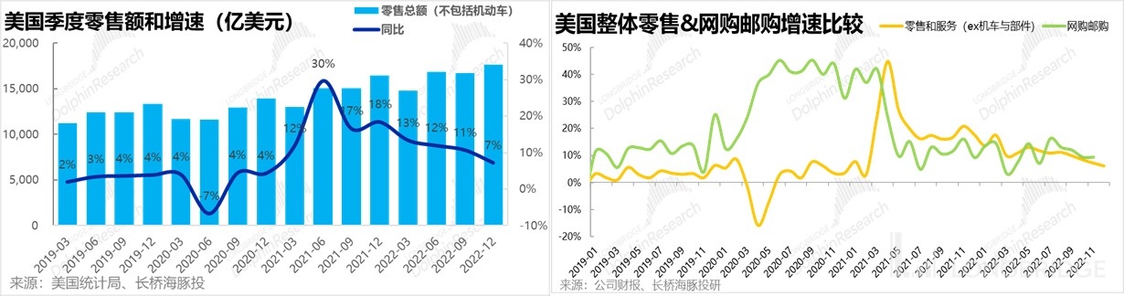 分地區來看,本季度北美地區的泛零售類業務同比增速達 13%。相比之下美國剔除機動車以外的零售總額在四季度僅同比增長了 7%,反映線上零售的網購郵購增速也降速到了 10% 以下,可以看到公司北美零售業務表現是明顯優於行業和市場預期的,這也符合我們就經濟不佳時線上零售反而會佔優的判斷。