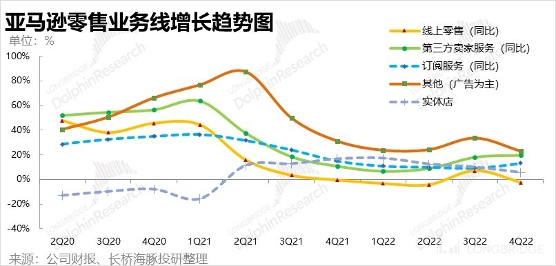 3. 零售板塊差中顯優:儘管 AWS 雲業務表現不佳,但公司的總營收和總經營利潤反而分別高出了預期 2% 和 10%,背後原因就是先前疲軟的零售板塊實際比預期堅挺。主要超預期的業務是 3P 賣家服務和廣告收入。其中,3P 賣家服務實現 363 億美元收入,同比增速逆勢提速到 20%,遠好於市場預期的 7%。廣告的營收增速也仍達到 18.9%。海豚君認為,亞馬遜通過一系列較為嚴厲的提價措施(即提高變現率)是 3P 業務超預期的主要原因。但同時,在經濟不景氣時商家對於變現更強、也更直接的電商平台依賴也會更高(類似國內拼多多),因此亞馬遜會相對佔優。