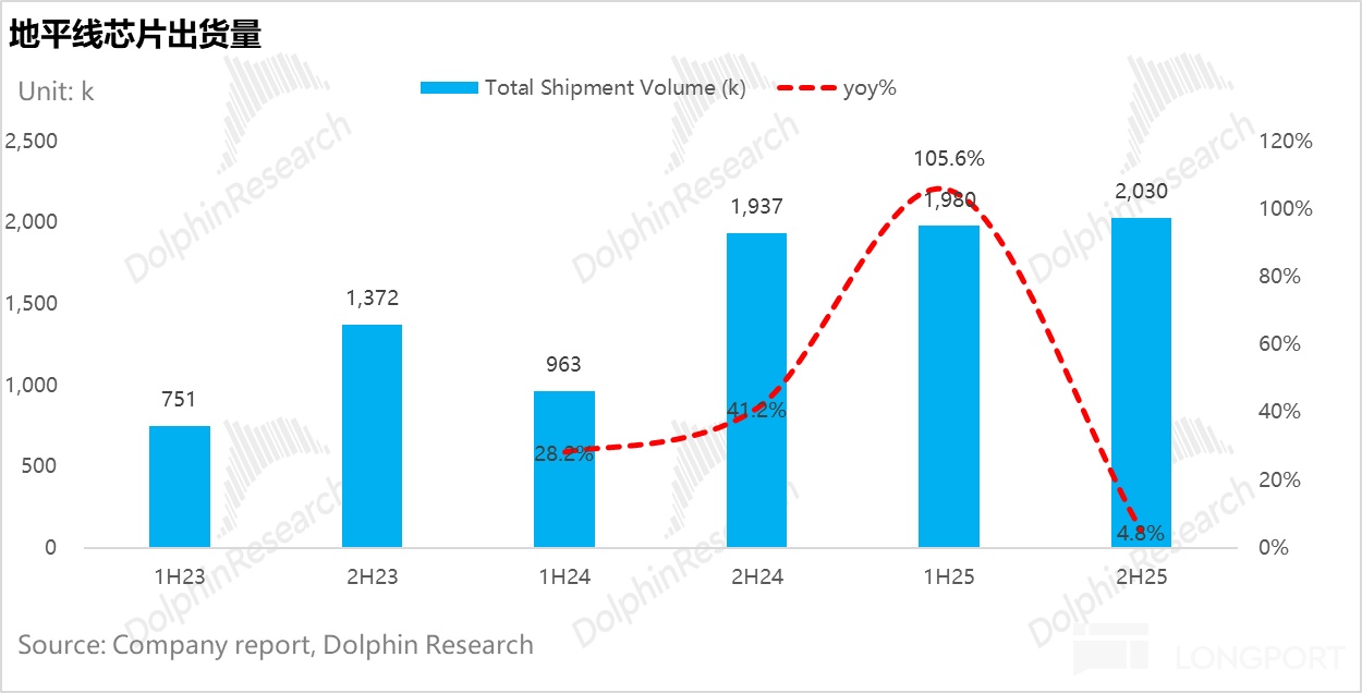 出貨量微增: 2H25 出貨量 203 萬顆,同比僅增 5%,略低於預期的 206 萬顆。
