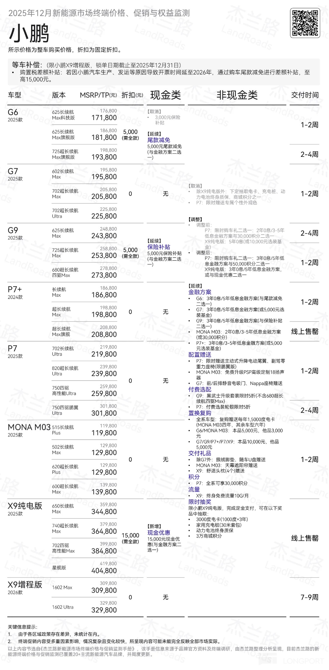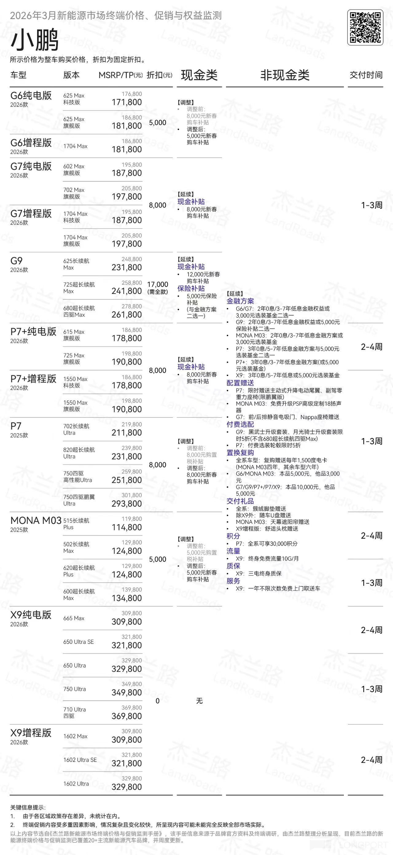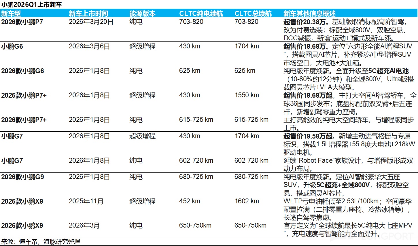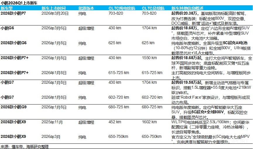 儘管一季度面臨傳統淡季與購置税退坡的雙重壓力,但小鵬同期密集打出了 G7 / P7+ / G6 / G9 的“純電+超級增程”組合拳。在“增程純電同價、增配不加價”的激進策略下,這些 1 月下旬已開啓交付的高續航新車(純電 430km/綜合超 1550km),未能如期提振終端需求,這難免引發市場對小鵬以本輪以“一車雙能”為核心的新車週期爆發力的質疑。