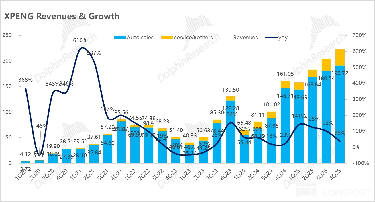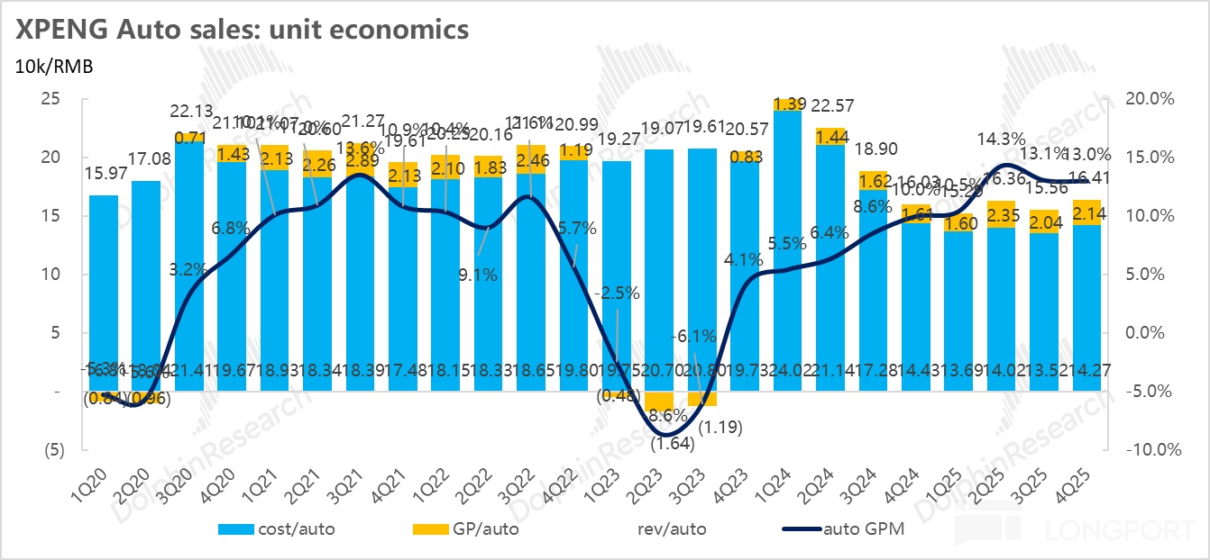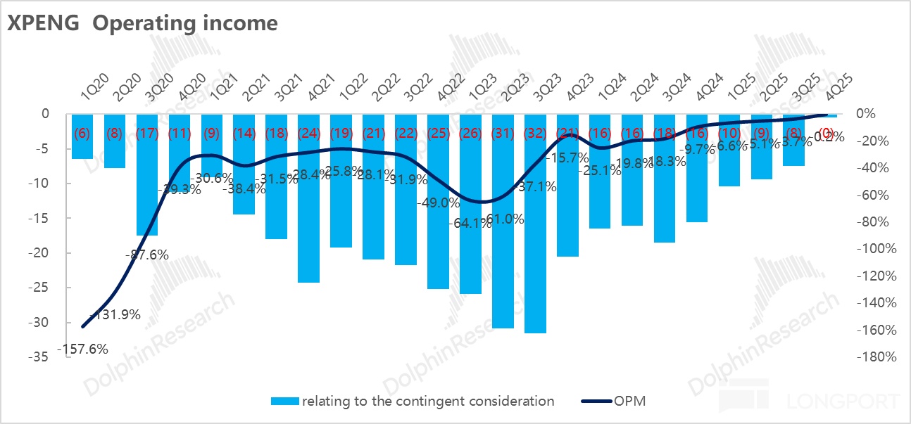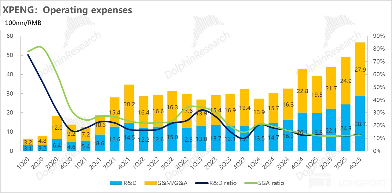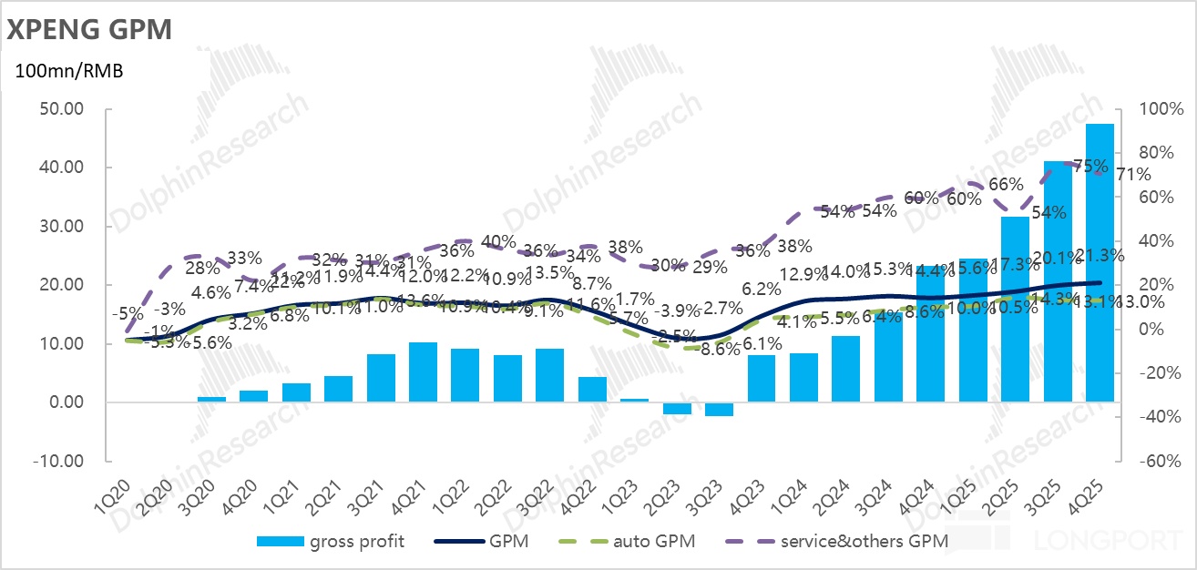 4)整體毛利率超預期,高度依賴高毛利的“服務及其他收入”的結構性拉動: 小鵬四季度整體毛利率 21.3%,超預期的 20.5%,主要得益於技術授權與碳積分天然的高利潤屬性,本季度“服務及其他”業務的毛利率高達 70.8%,直接貢獻了高達 22.5 億元的毛利額(佔比僅 14% 的非賣車收入,貢獻了公司近一半的毛利潤),大幅超出市場預期的 17 億元。