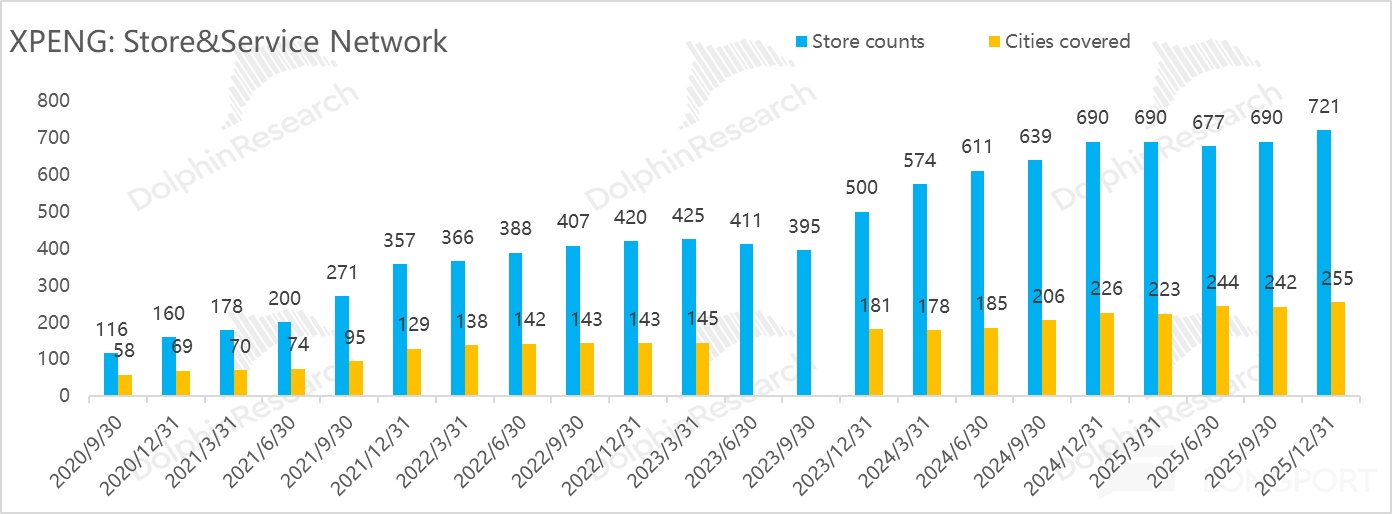 ② 渠道網絡擴張: 為承接 2026 年“一車雙能”的下沉戰略及 4 款全新 SUV 的流量,小鵬在四季度顯著加快了建店步伐。單季門店數新增 31 家(總數達 721 家),覆蓋城市增加 13 城(總數達 255 城)。這種渠道的快速鋪設,帶來了租金、人員等剛性開支的直線上升。