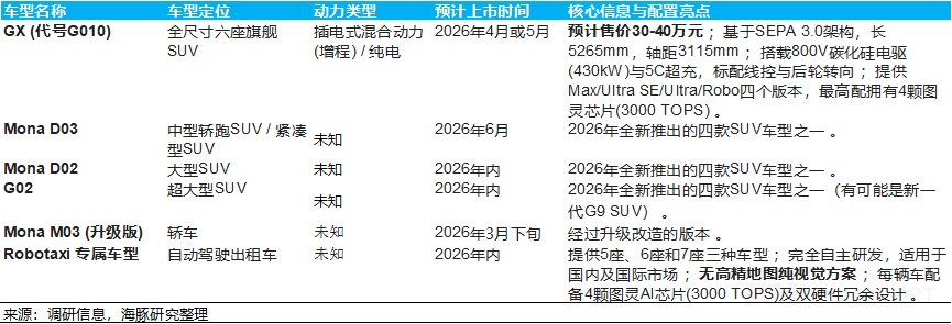 雖然 Q1 開局不利,以及小鵬還未給出2026年的交付量目標(重點關注業績會指引),但市場依然預期小鵬 2026 年交付量能達到 52 萬輛(同比提升21%)。這一增量主要由超級增程車型以及計劃在 2026 年推出的四款全新 SUV(包含 Mona D02、Mona D03、GX 及 G02/G01)所驅動 。