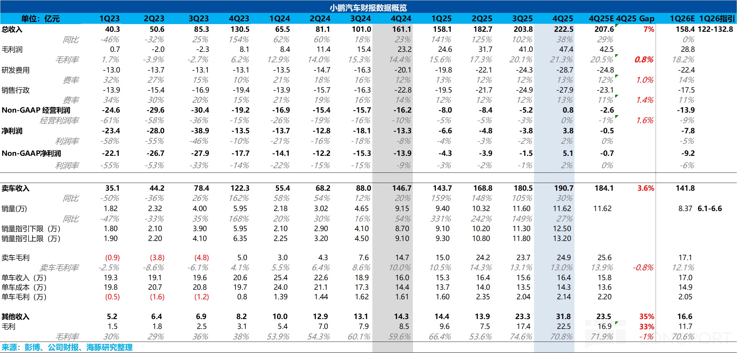 $小鵬汽車(XPEV.US) 於北京時間2026年3月20日港股盤後、美股盤前發佈了 2025 年四季度財報,整體而言,雖然小鵬的表觀業績不錯,但真實的造車業務表現指引卻透露出不少壓力,具體來看: