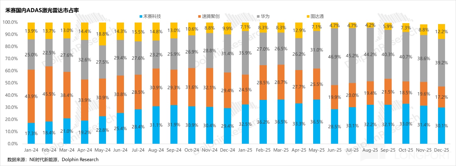 因此,在獨立第三方 Tier 1 市場中,實際的角逐仍集中在禾賽、速騰聚創和圖達通之間。目前,禾賽憑藉低價 ATX 的強勢出貨,四季度在乘用車激光雷達的市佔率達 31.3%,高出 “龍二” 速騰聚創近 13 個百分點,仍然穩居行業第一。