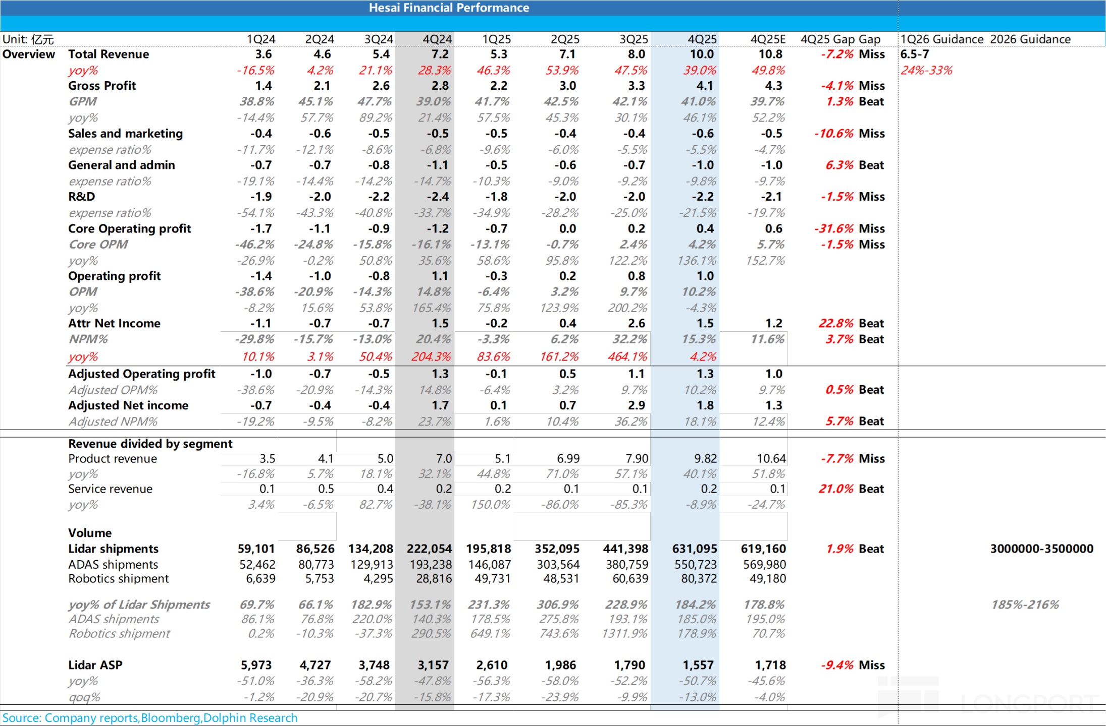 4) 規模效應與技術降本發力,毛利率仍然穩健:儘管面臨單價快速下沉的壓力,禾賽四季度依然實現了約 41% 的毛利率,高於市場預期的 39.7% 及公司指引的 40%。這主要由於: