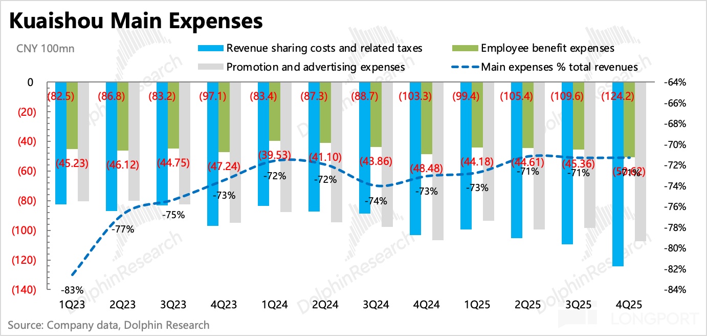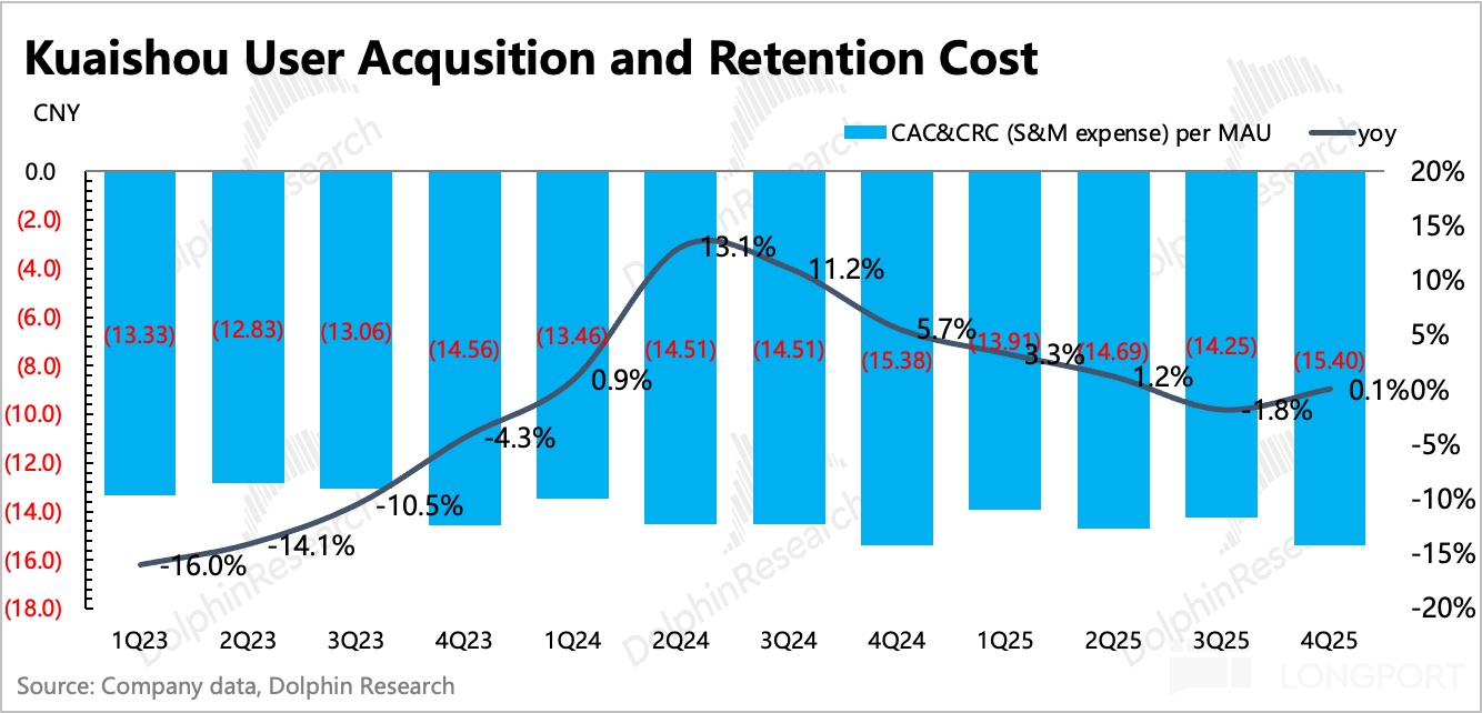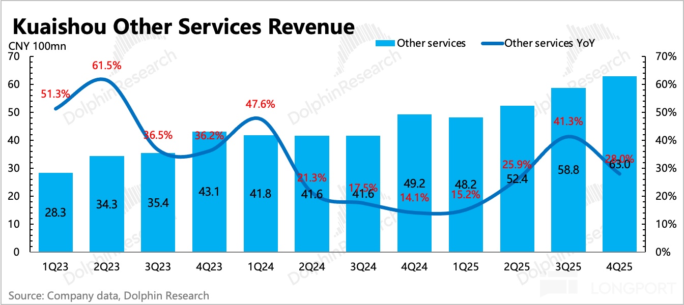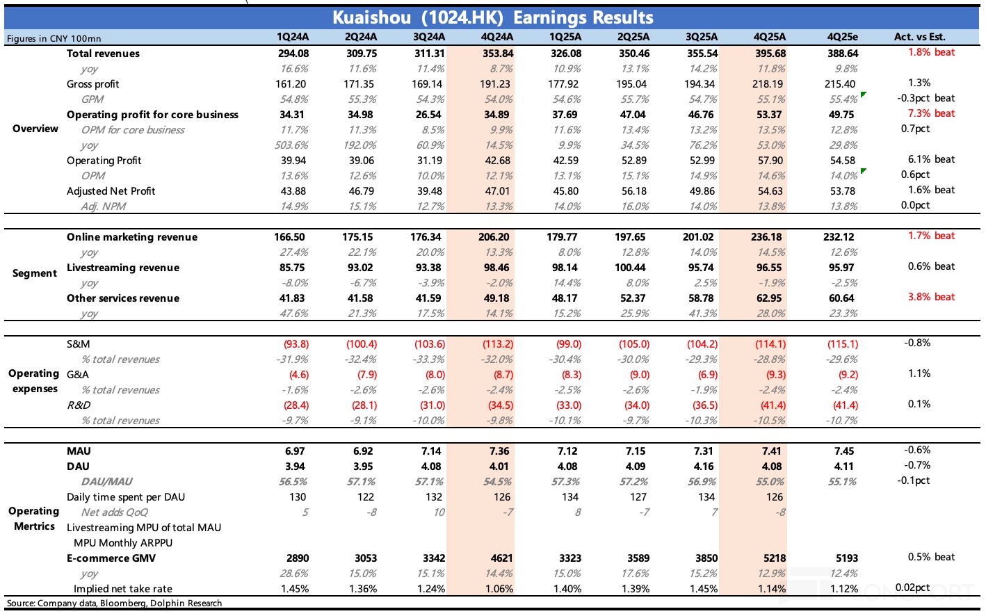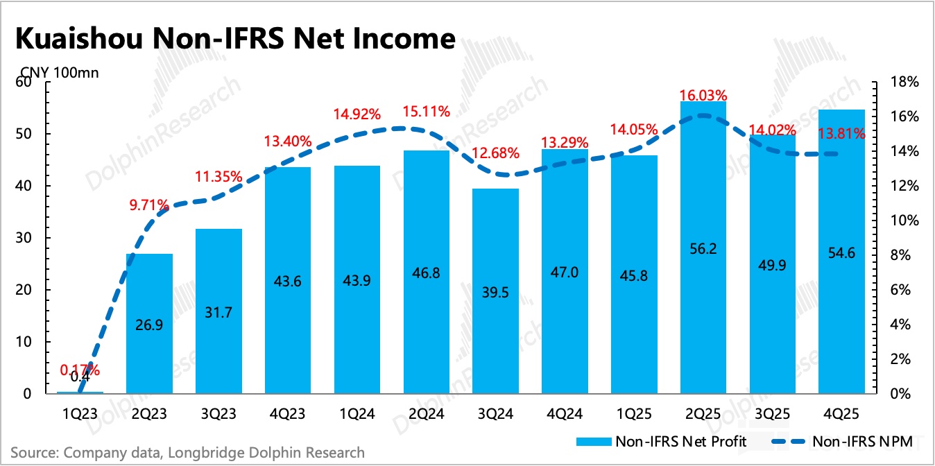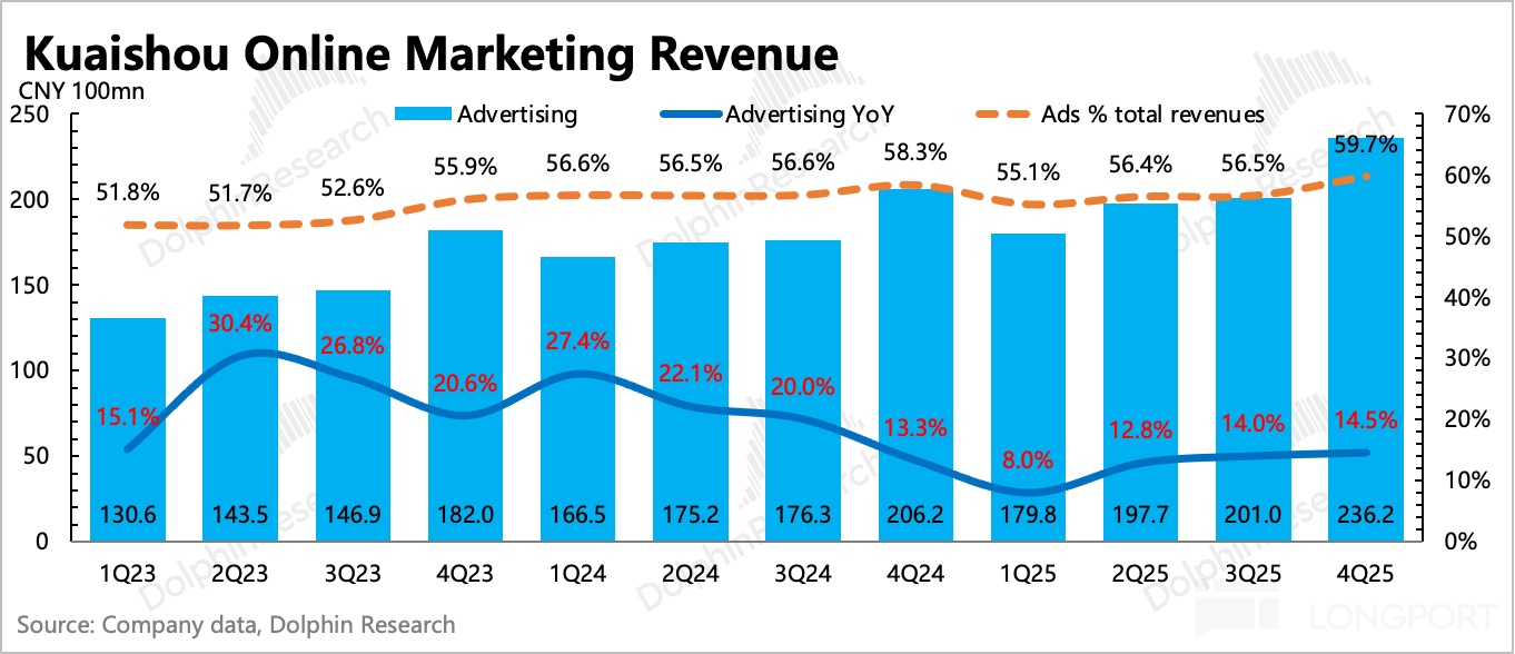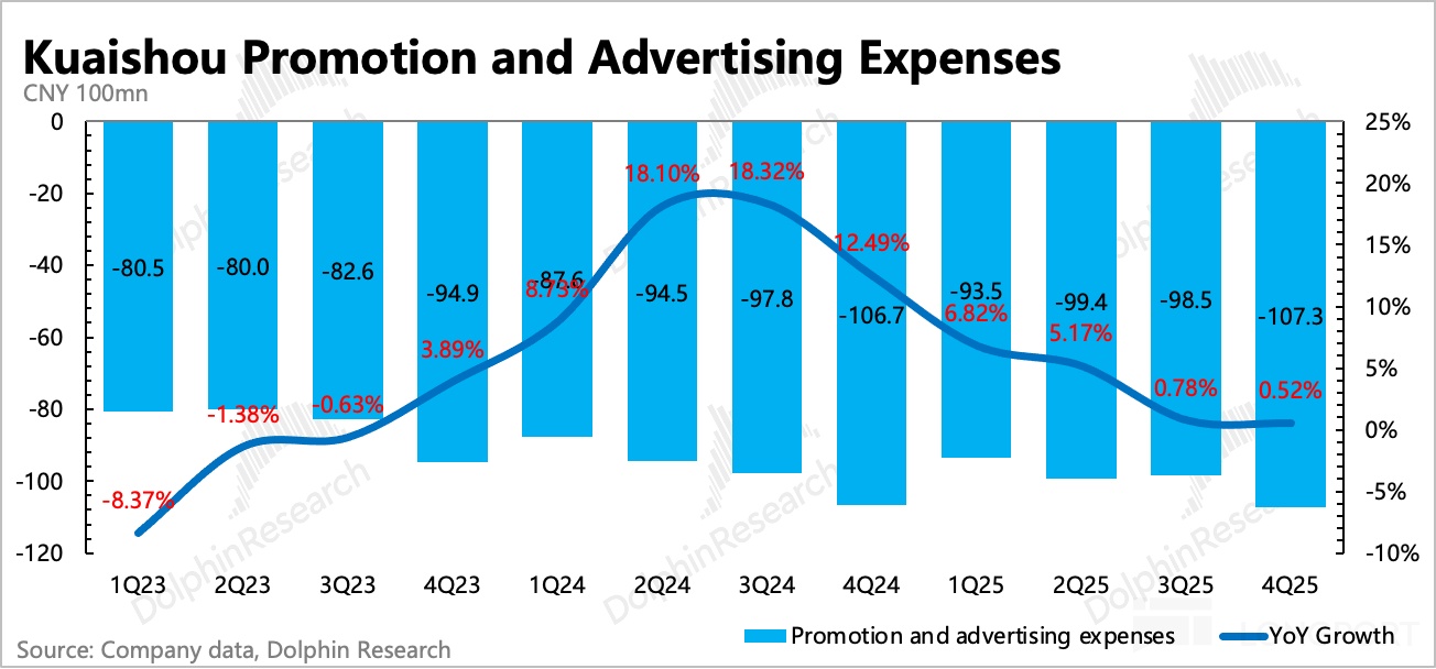 4. 廣告小超預期,關注投流税影響:Q4 營銷廣告收入增速 15%,相比三季度繼續微幅回暖,小幅超市場預期。市場或擔心消費大環境、同行競爭以及投流税影響,對廣告增長的預期並不算高。不過關於投流税影響是否會在 2026 年進一步擴大,建議關注電話會管理層交流。