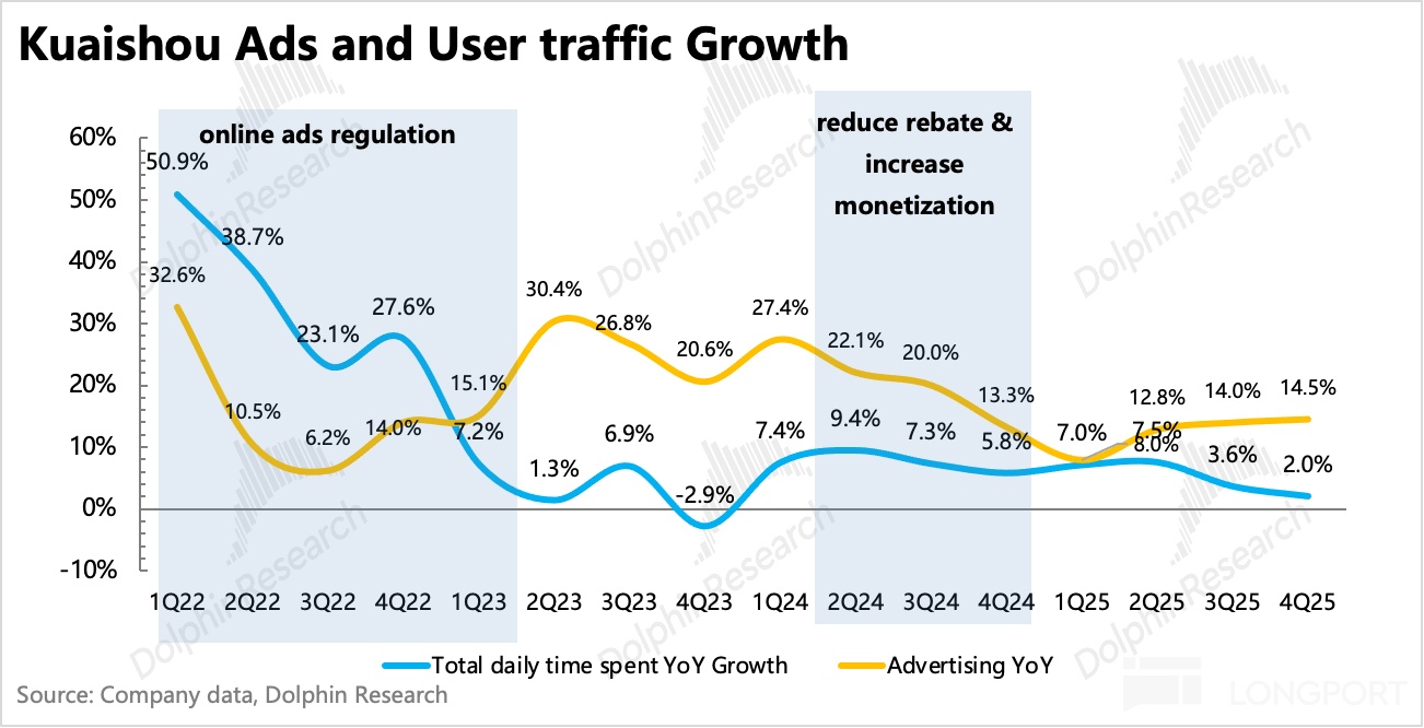 Q4 業績不算差,尤其是在當前大約 9x P/E 的估值水平下,隱含市場預期也已經下調甚至趨於保守。不過,市場的擔憂也並非完全沒有道理——用户增長接近停滯,並不能對傳統業務在政策環境(投流税&實物消費低迷)、同行競爭下,給到一些 “額外” 的支撐。因此可以説,快手的增長希望基本在 AI 上,包括廣告端,ToC 的 AI 漫劇,ToB 的 AI 數字營銷、AIGC 解決方案帶來的增量收入,以及關鍵業務 “可靈”。