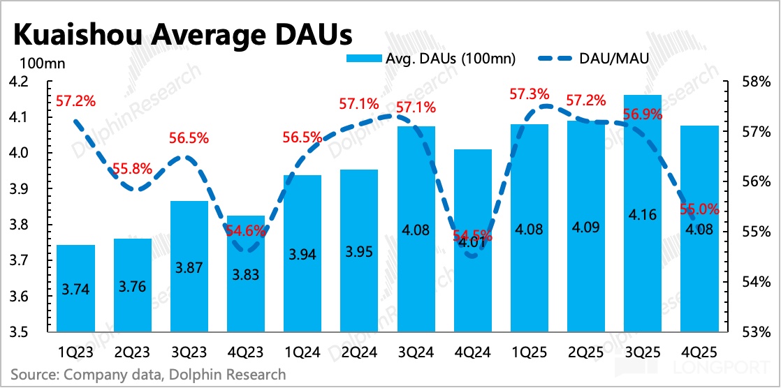 實際 Q4 收入 3.4 億,處於指引與市場預期的下沿。一般公司 preview 會和機構有一些溝通,再加上 12 月衝高後 1 月快速滑落(iOS 端),2 月可靈 3.0 雖有更新,但 Seedance 2.0 爆火,也影響了可靈流水的反彈,因此很可能機構預期順勢已經做了向下調整,從而壓制了快手 2 月以來股價表現。