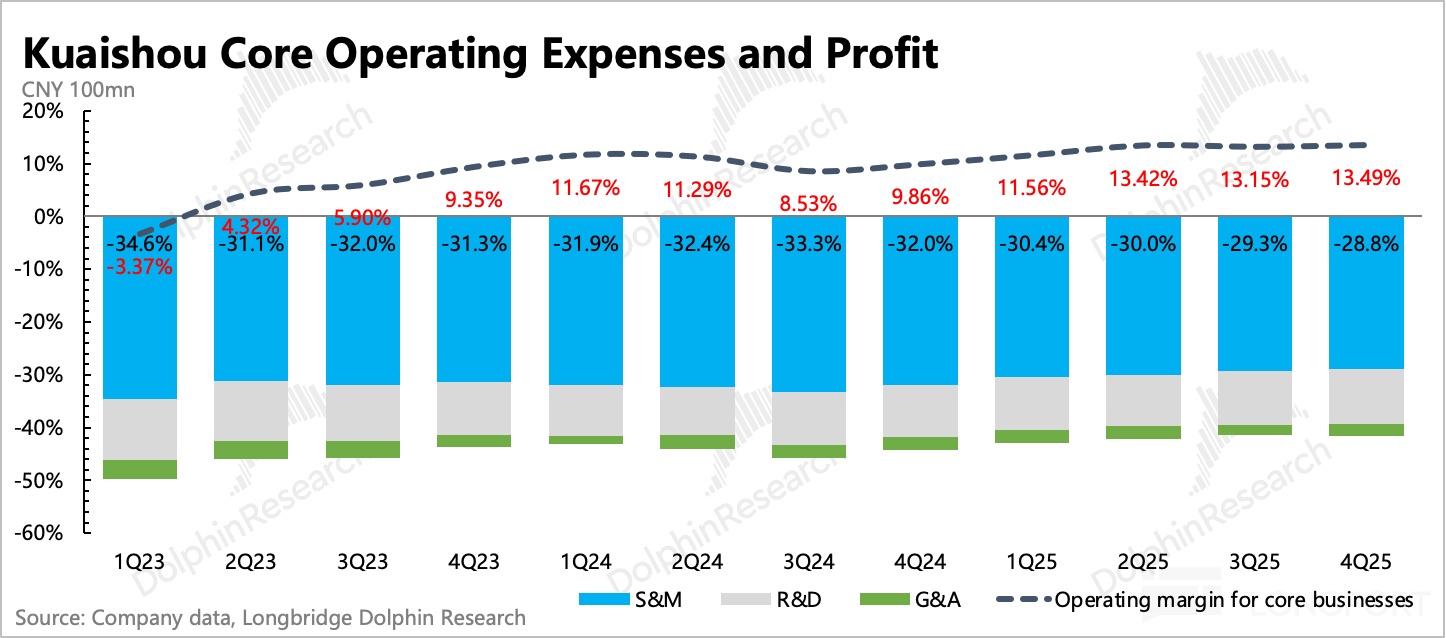 1. 經營提效今年還能繼續嗎?:儘管 AI 投入在逐步確認(設備折舊成本同比增長 10%、研發費用同比增長 34%),但在基本運營類的費用上,公司做了一些控制,比如僱員費用整體增長 4%、推廣營銷費用同比持平。因此核心經營利潤率 13.5%,同比提高 3.5pct,環比也略微提升了 0.4pct。
