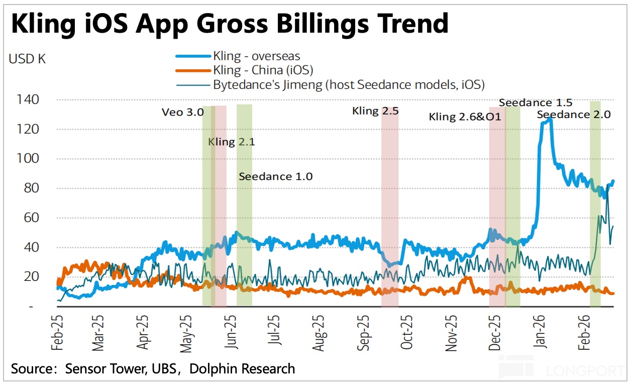 2)受益於 12 月 2.6 版本和 2 月 3.0 版本中亮點功能的上線,電話會中公司披露今年可靈 1 月 ARR 已超 3 億美金,並指引 26 年可靈增速至少翻倍(即 21 億人民幣以上),高於市場的增速預期(+85%yoy)。而市場參考的 iOS 流水變動趨勢,則遺漏了佔比越來越大但不能很好跟蹤的 ToB PC 端表現。