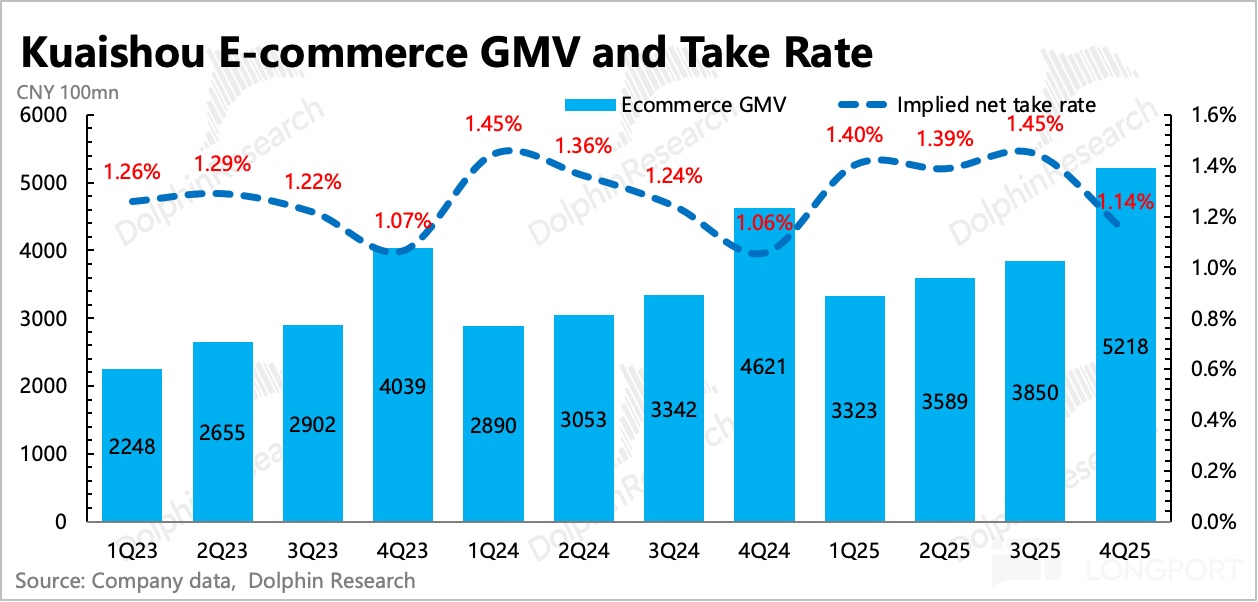 3. 電商增長穩定:Q4 電商 GMV 增速 13%,相比上季度有所放緩,全年近 1.6 萬億交易額。在達人選品分銷、全託管以及超級鏈接服務下,整體電商佣金變現率同比提升 8bps(環比則因旺季佣金返點增加而下滑),使得電商收入同比增速近 22%,小幅超出頭部機構預期(18%yoy)。