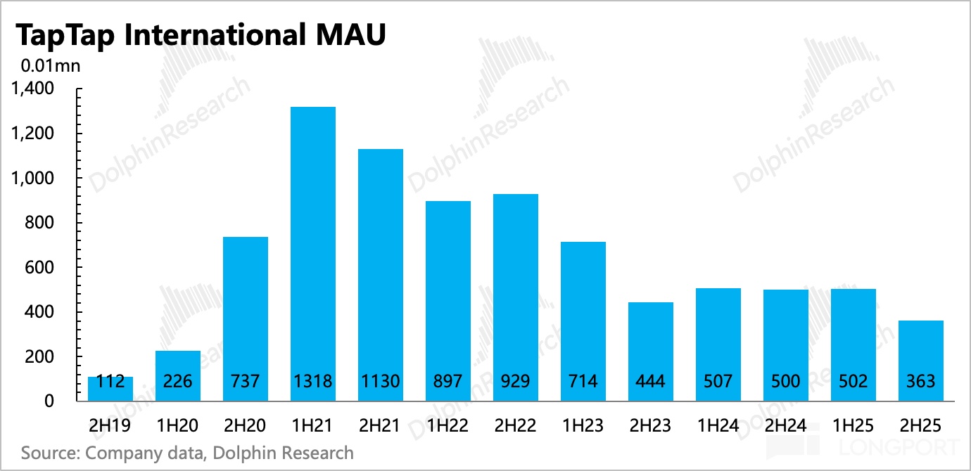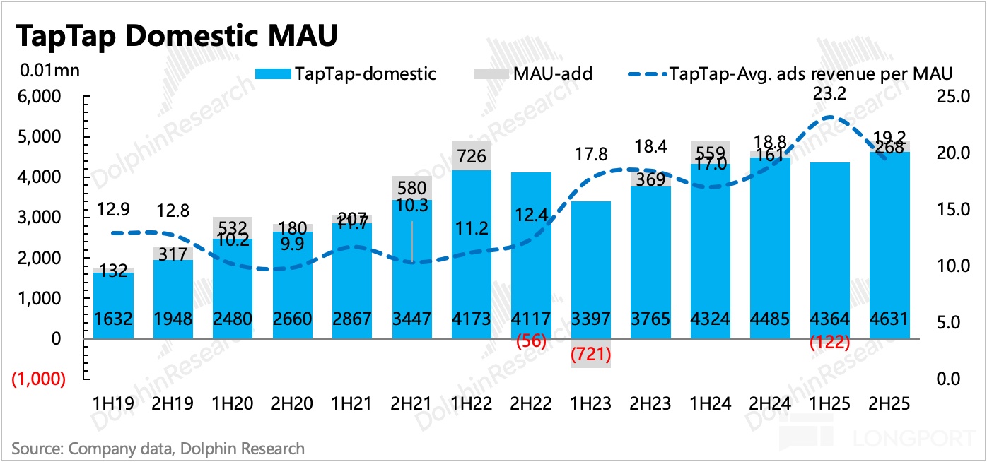 不過 MAU 下半年預計淨增明顯(年度 MAU 平均值倒算),可能主要源於去年 7 月 TapTap 小遊戲的推出。今年看看能否在《心動小鎮國際服》和《仙境 RO 守愛 2》的新遊帶動下,用户規模可以持續擴張,以此來支撐 TapTap 的宣發價值潛力。