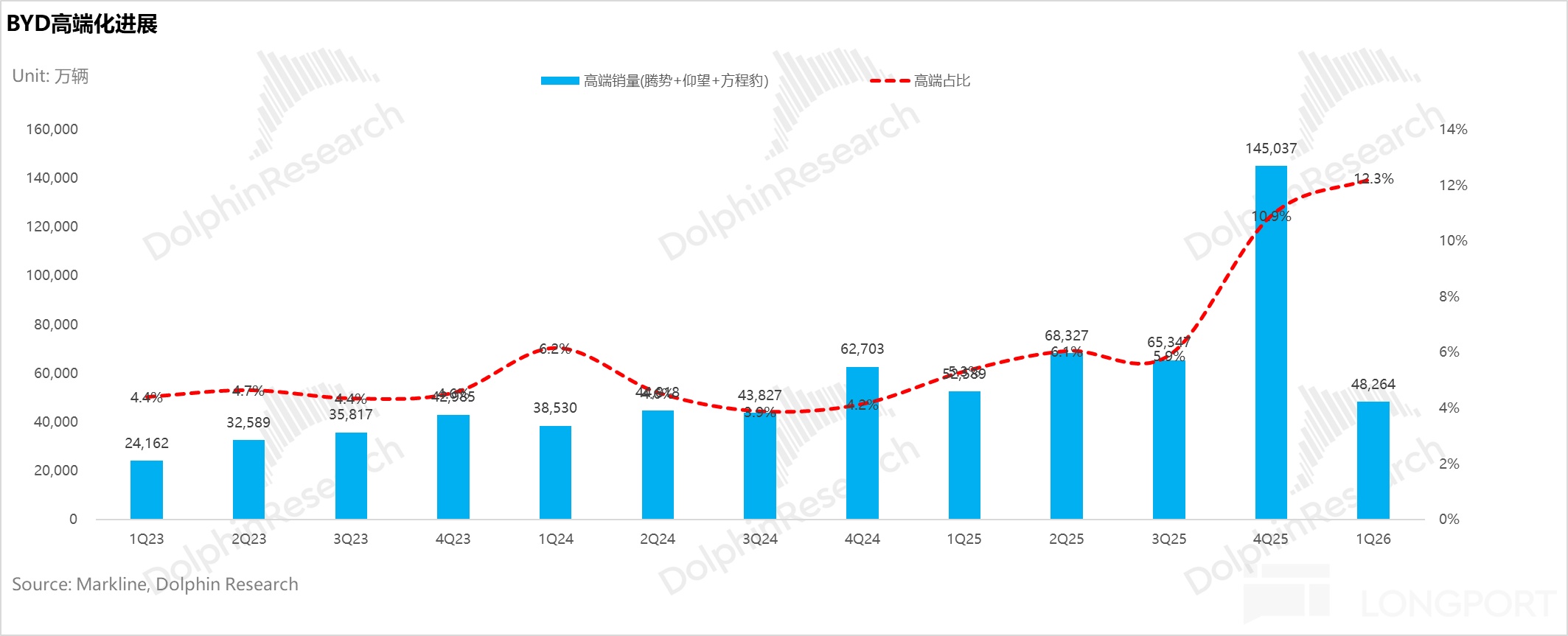 單從數據上看,2025年四季度比亞迪高端品牌矩陣(騰勢、仰望、方程豹除鈦3)合計銷量達14.5萬輛,環比實現近1.2倍的快速增長。高端車型在總銷量中的佔比,也從三季度的約6%快速躍升至接近11%,高端化戰略似乎取得了突破性進展。