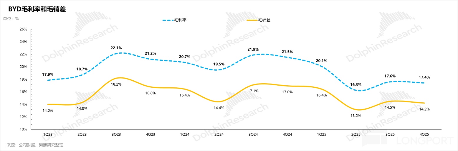 但實際的賣車毛利率僅21.6%(環比提升1個百分點),主要由於面臨供應鏈成本端的上行,以及為了讓主力DM-i車型(如秦、宋系列)滿足2026年新的購置税免税門檻,比亞迪被迫實施“加配不加價”策略,拉高了BOM成本。