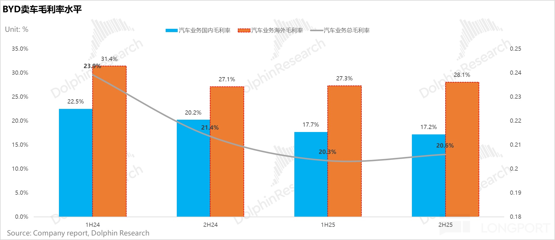 反映在利潤率端,四季度整車銷售毛利率 21.6%,同樣低於市場 22.5% 的一致預期。深入拆解來看,整體毛利率的承壓主要源於國內市場的持續內卷,而海外高盈利則再次扮演了“救駕”的角色: