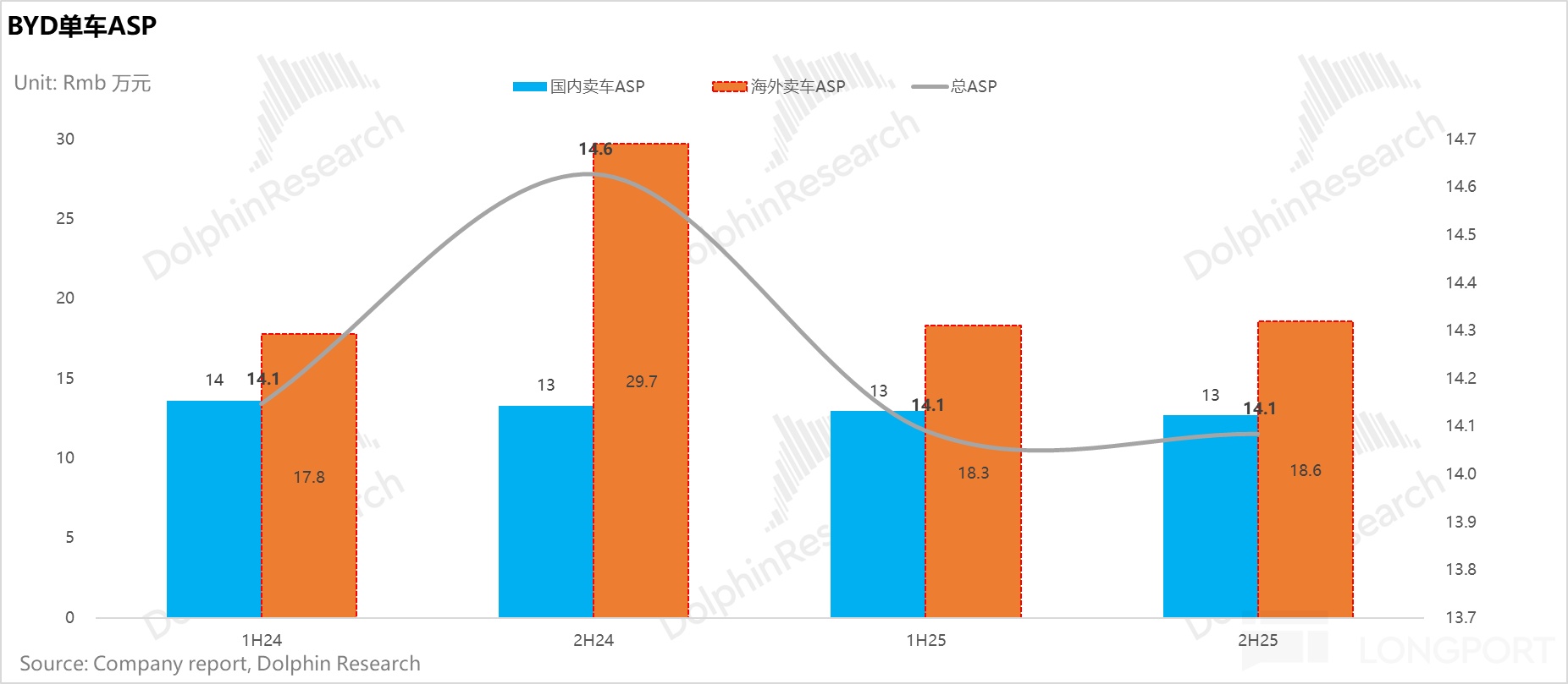25年下半年比亞迪海外車型ASP高達18.6萬元(環比提升0.3萬元),是國內車型ASP(環比下滑0.3萬元至12.7萬元)的約1.5倍。