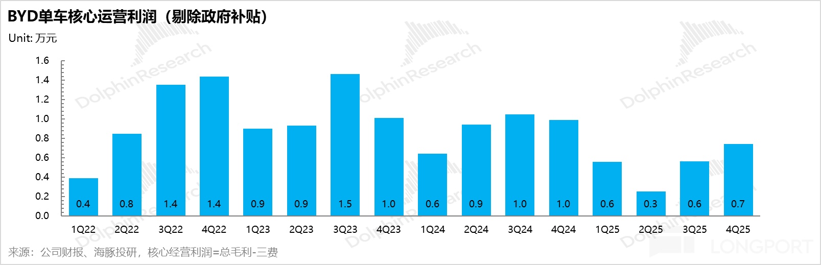 而如果看比亞迪的單車核心利潤情況(核心經營利潤=總毛利-三費),比亞迪的單車核心經營利潤本季度繼續回升,從三季度的0.57萬元回升1800元至0.74萬元,環比回升的主要原因仍然是賣車毛利率的環比上行,以及四季度銷量槓桿效應的釋放,核心經營利潤率也從上季度的3.2%環比上行至本季度4.2%。