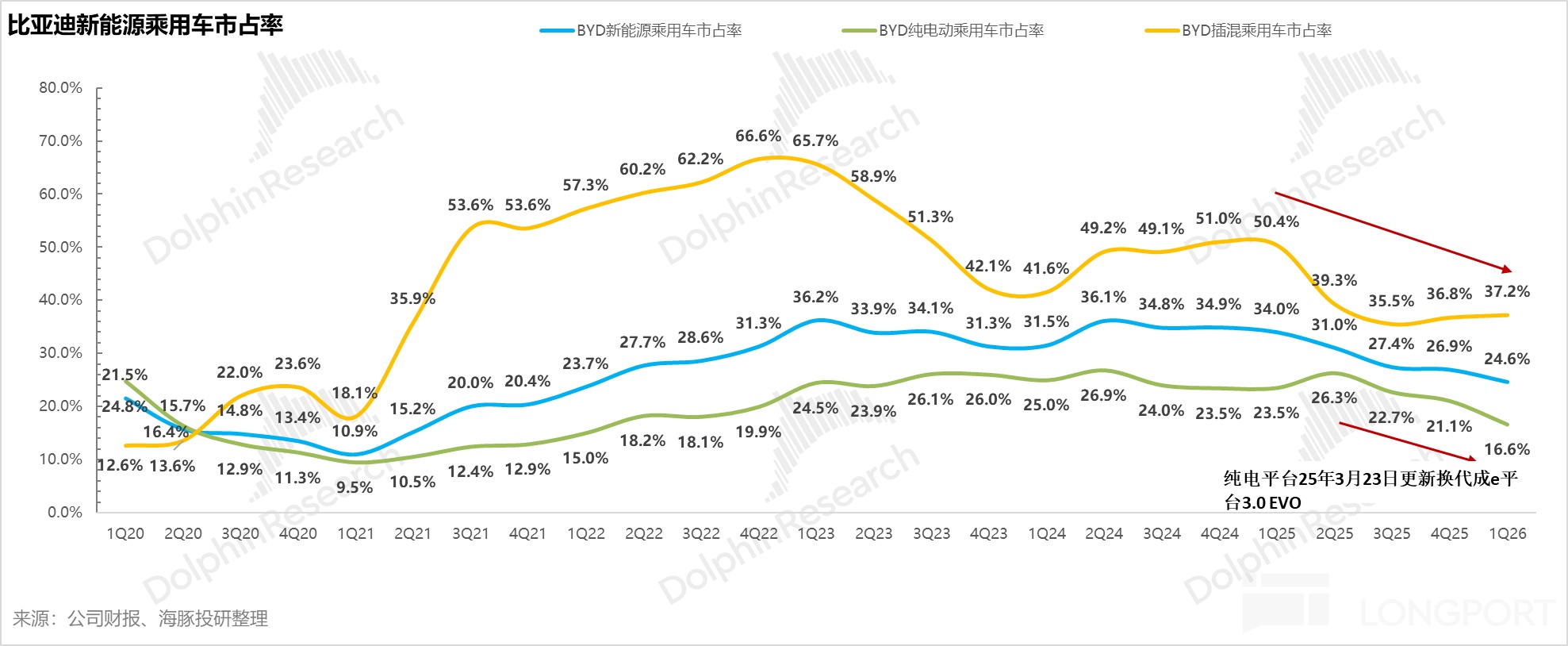 純電車型面臨更劇烈的縮量壓力,市佔率從2025年一季度的26.3%鋭減至2026年1-2月的16.6%。2025年3月,比亞迪雖推出了搭載新一代超快充電池、高性能電機及SiC功率模塊(支持1500V高壓及200°C高温作業,實現“充電5分鐘續航400公里”)的超級E平台,但該技術前期僅侷限於漢L、唐L等20萬元以上高端車型。由於核心技術未向走量車型下放,加之自營超充網絡仍處建設爬坡期,未能有效阻擊競品在主流純電市場的攻勢。