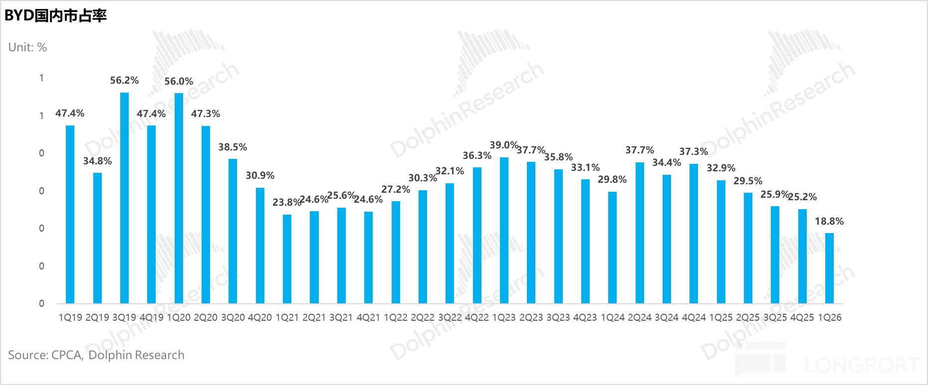 而使單車毛利和淨利低於預期的“罪魁禍首”仍然是由於國內“壓力山大”的賣車表現,25年下半年國內賣車單價和賣車毛利率都還在環比下滑,賣車壓力仍大,比亞迪也難以守住曾經的“王者寶座“,市佔率也在止不住的丟掉,而海外的高增反而成為了穩住業績的“壓艙石”。