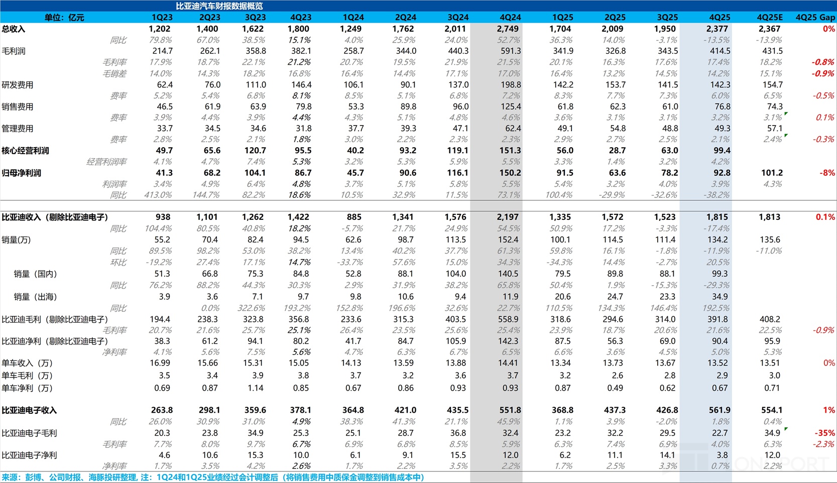 1. 收入雖高於預期,但由比亞迪電子帶來,賣車收入基本與預期持平:四季度,總收入2377億,略超預期2367億,但主要由非核心業務的環比高增帶來。