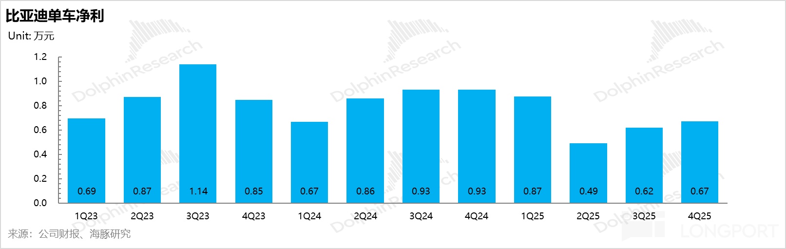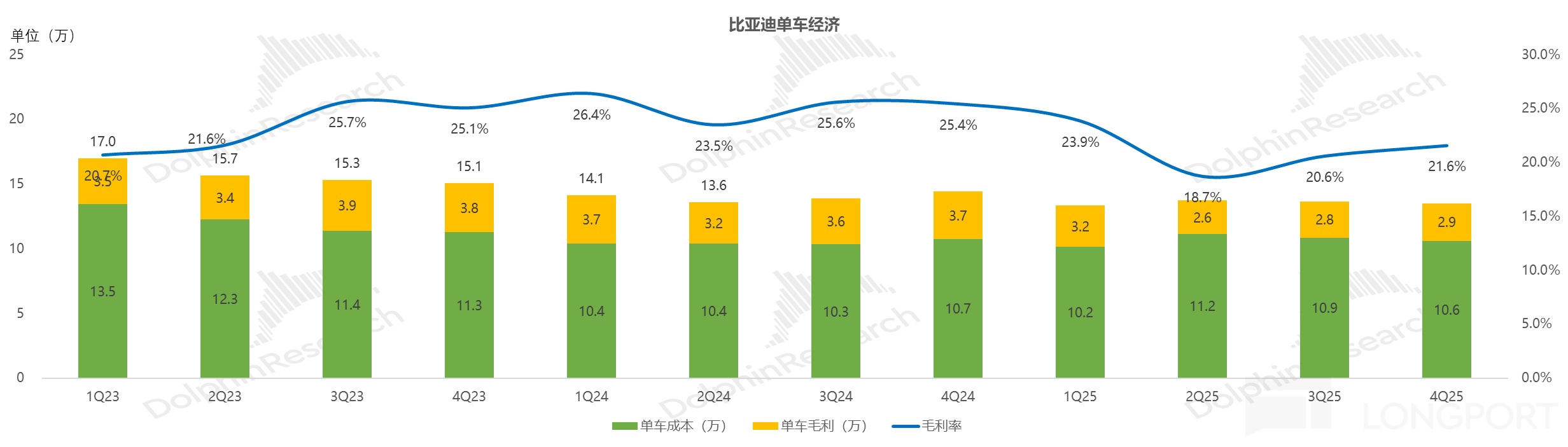 四季度比亞迪實際賣車毛利率21.6%,僅環比上升1個百分點,低於市場預期22.5%,而本季度賣車單價13.5萬元,環比三季度13.7萬元還要下滑1500元,賣車單價還在下行軌道。
