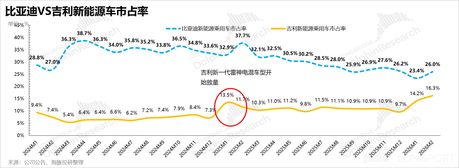 主流價格帶面臨結構性侵蝕:在10-20萬元基本盤中,競品展開“貼身肉搏”。吉利銀河系列憑藉“高配置+強性價比”策略搶佔身位,銷量近乎翻倍,帶動吉利新能源市佔率在2026年2月回升至16.3%。同時,零跑、長安、長城在各自細分市場發力。儘管比亞迪通過推出長續航版本(如秦PLUS 128km版)勉力將插混市佔率維持在36%左右,但統治力已不及往昔。