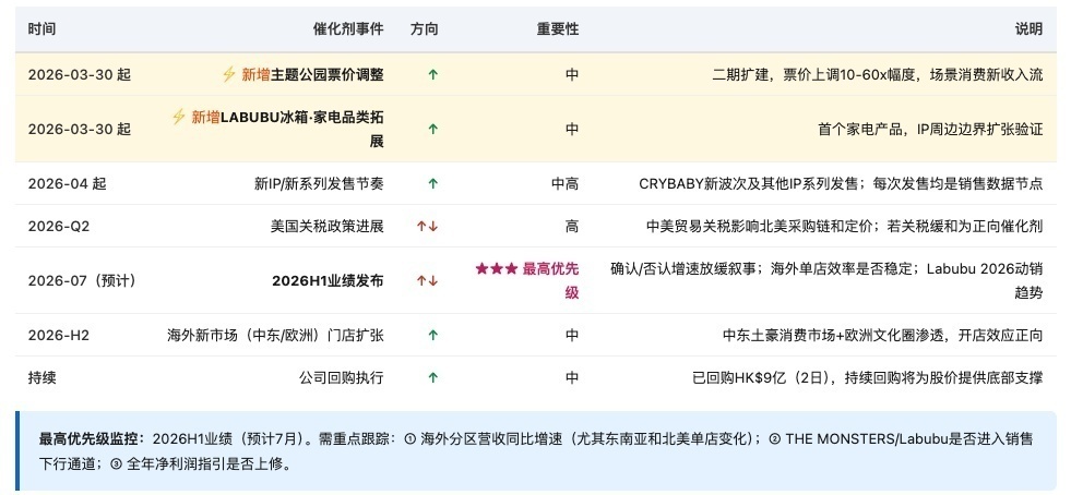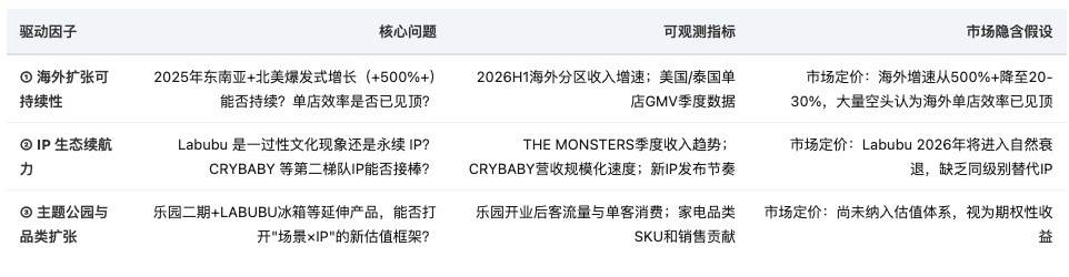 若 CMB 論點成立,2025A 海外高增速是"最後的榮光"而非可持續趨勢。2026H1 海外分區數據是驗證分水嶺。迪士尼的高 PE 很大程度源於主題公園對 IP 的場景化變現,泡泡瑪特第一樂園二期的收益貢獻尚未被市場納入任何估值框架。歡迎交流