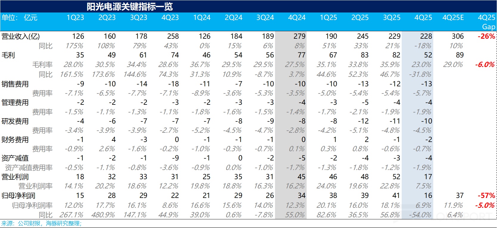 b. 收入 372 億元,同比增長 49%;毛利率 36.5%,基本持平。Q4 毛利率下滑至約 24%,環比下降約 17pp,原因包括:Q3 有英國等海外大項目高基數、碳酸鋰漲價傳導、國內及美洲收入佔比提升拉低結構、年底集中結算售後成本及渠道返利。