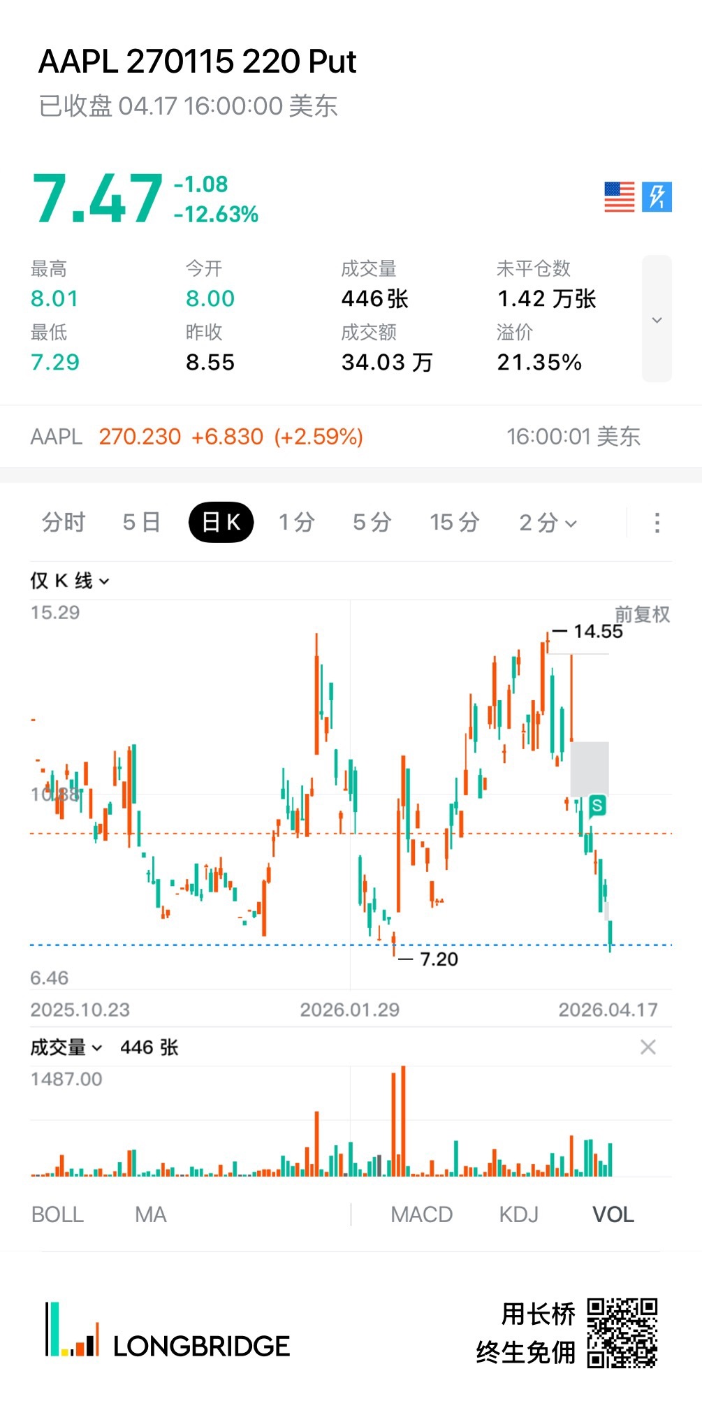蘋果是七姐妹裏面屬於波動比較小的一個,美伊在巴基斯坦談判了一整天無果後,雖説沒有達成協議,但是雙方都已經打不動了,儘管還是在互相丟垃圾話。所以在 13 號週一,賣出了 appl 270115 220 put,覺得美伊再怎麼打,(除非核戰爭,但這是不可能的)在明年年初不會跌到 220。