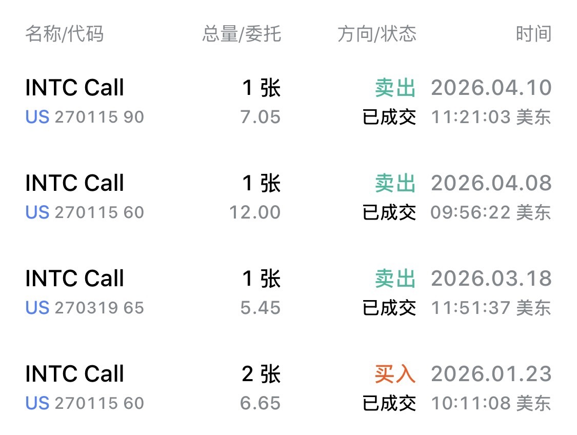 英特爾其實在行權後就是奔着賣 call 來賣股票,回收現金,因為英特爾要徹底起飛,還有很長路要走,所以大起大落在所難免,所以在 3 月 18 號當天賣出了一張 intc 270319 65 call,這個 call 賣點不是很好,也算是拿他練下手,因為當時也不知道戰爭到底要打多久,想着一兩個月後趁低點給他平倉,沒想到是個大盤逆子,別人因為海峽封鎖石油價格暴漲在那裏跌,他卻穩如泰山,上上下下。幸好在英特爾財報暴跌當天買了兩張 intc 270115 60 call,算是多空對沖了。這個 60call 在 4 月 8 號傳出雙方準備談判的好消息,賣了一張,剩餘一張拿來對沖。並在 4 月 10 號再賣出一張 intc 270115 90 call,這張 call 就完全是賭一把了。