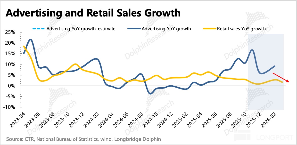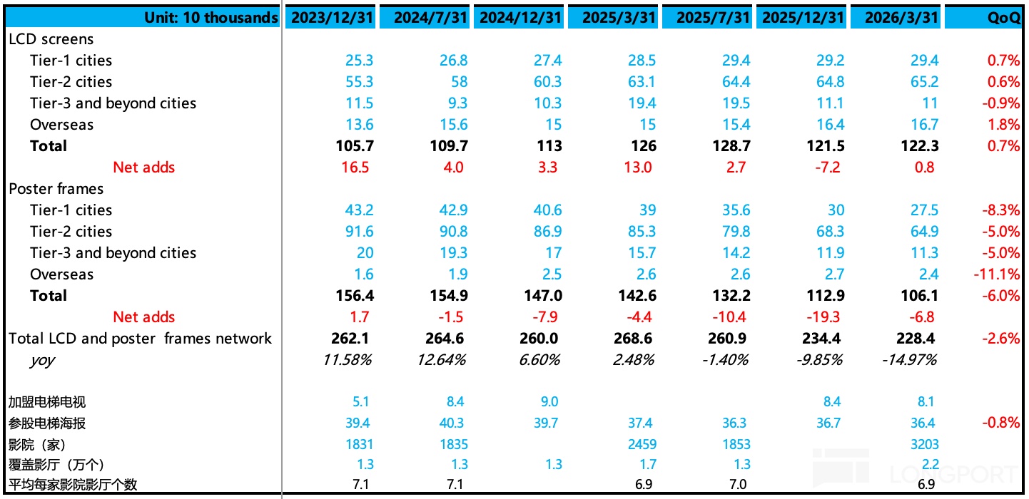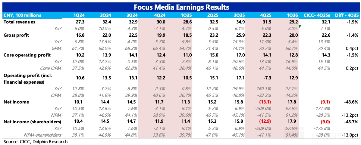 收入端,Q4 和 Q1 的收入增速分別為 5% 和 2%,均低於年初機構預期。按照 2H25 數據,其中梯媒增長 5%,影院廣告直接跟隨票房一起歇了。