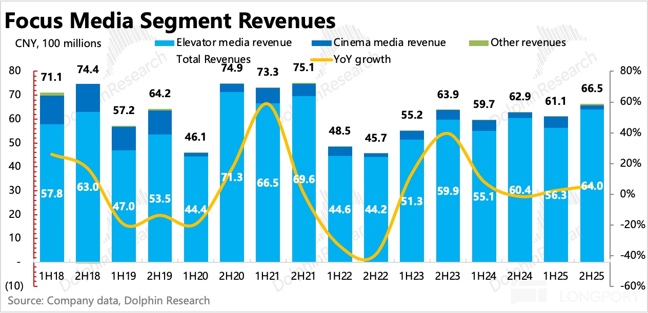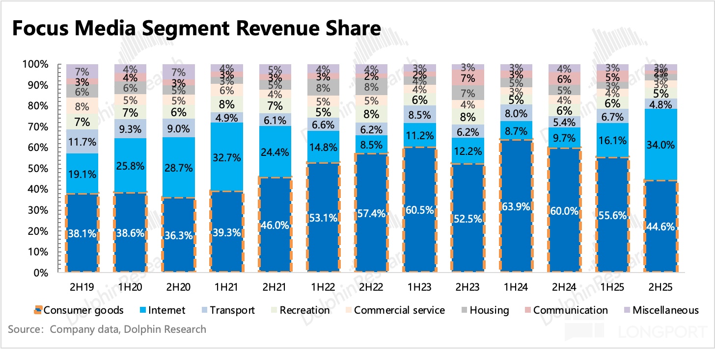 (3)線下投放繞不開的渠道:財報中還有一個有意思的點,就是大廠之間的外賣大戰和 AI 入口之爭的激烈對抗,在分眾來自互聯網客户的廣告收入具象化了。2025 年下半年,互聯網行業的廣告收入同比暴增 270%,絕對值規模達到了 2020 年下半年至 2021 年上半年期間,疫情帶來的線上經濟紅利時期。