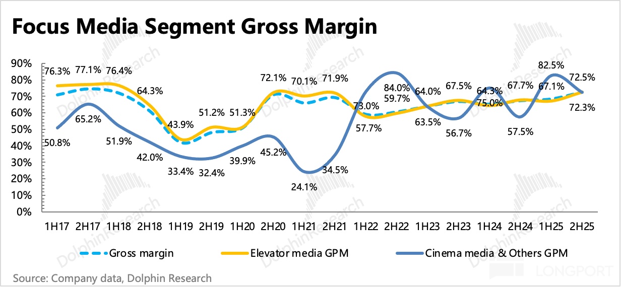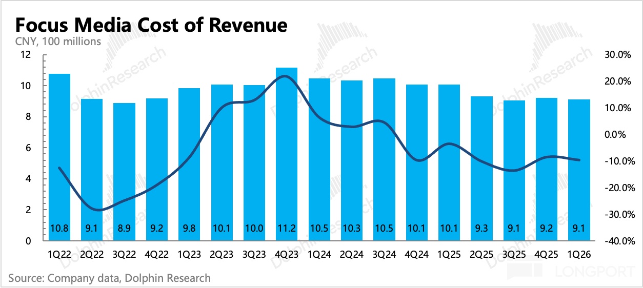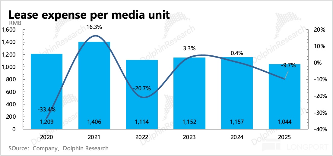 毛利率的穩步提升趨勢,主要得益於分眾整合行業,優化媒體點位(持續關閉低效益點位)、提高對上游的物業租金議價權的體現。這一點海豚君在前幾個季度已經從財報中點出,儘管新潮收購還沒過審,但市場已經先一步反映預期影響——經海豚君粗略計算,分眾成本絕對值同比持續下降。而平均媒體點位的租賃成本近三年持續下降。前兩年有疫情影響,25 年的下降則更可能是與收購整合有關。