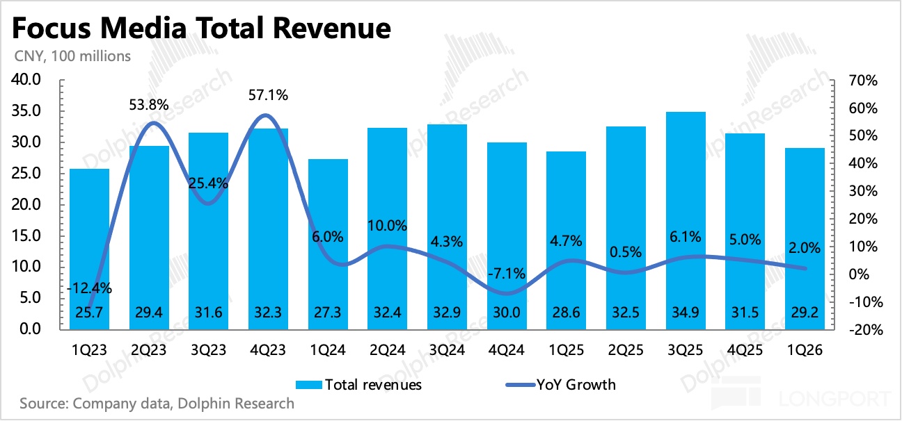 分眾的一季度業績側面反應了年初因春節時間錯位而形成的消費 “虛火”,隨後在 3 月迴歸弱現實的壓力。雖然 AI 等新事物光速發展,大廠們之間繼外賣大戰之後的 AI 入口之戰,增加了營銷投放需求,但整體 Q1 僅 2% 的收入增速,還是體現了商家在消費環境平淡下的謹慎預期,不過還是要比外部草根調研的刊掛率數據表現有韌性的多、也小優於機構近一個月已經下調後的預期。