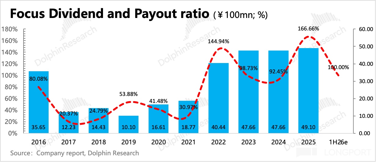 因此這也支撐了管理層在利潤腰斬下仍然保持分紅絕對額的增長,這樣 2025 年全年分紅 49 億,相對歸母淨利潤分紅比例達到 167%、目前 880 億市值,股東回報為 5.6%。