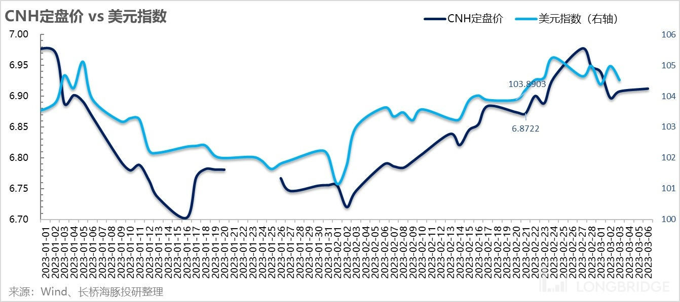而對應貨幣的相對強弱上,因此美債收益率衝高回落與美元指數的衝高回落基本同步同頻,人民幣相對美元的強弱則保持基本穩定。