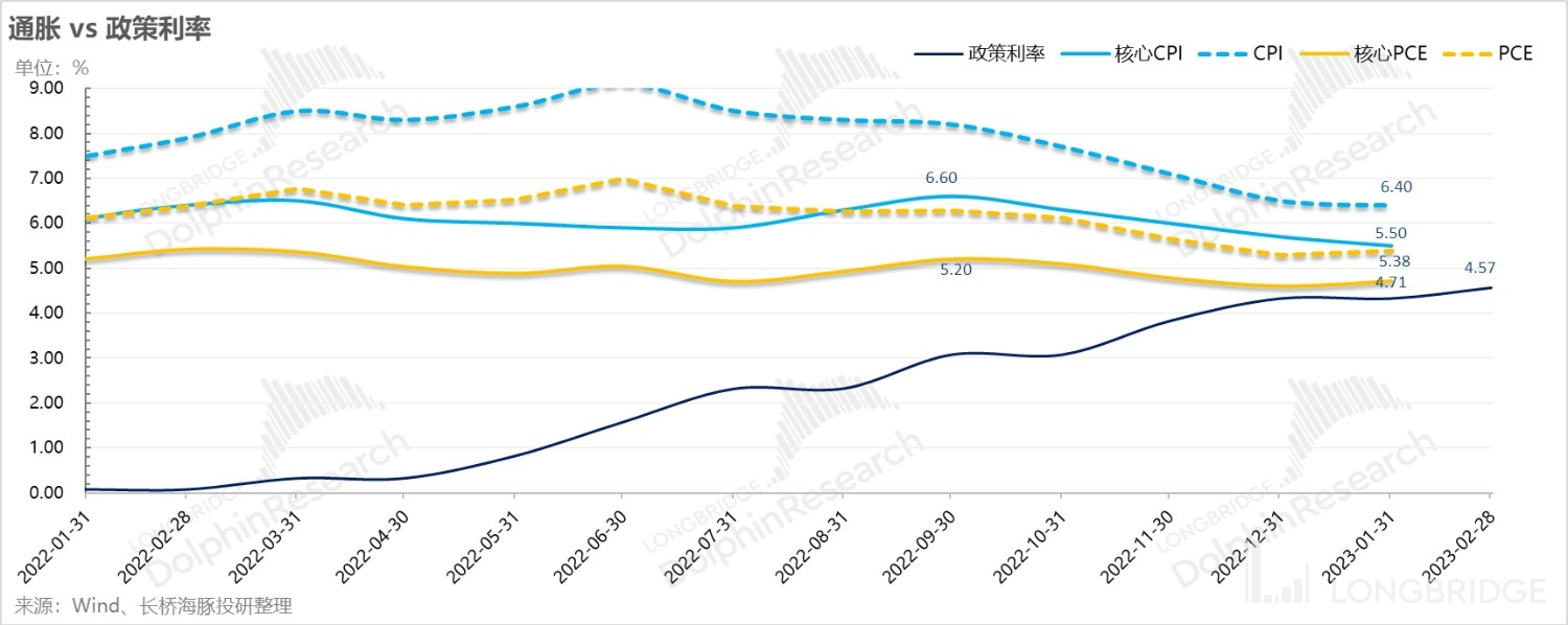 這一市場預期對應的主要通脹指標來看,除了低於目前的 CPI 之外,其他已基本全線高於市場當前其他主要通脹指標,核心 CPI,PCE 與核心 PCE 等,等於當市場把加息的頂點預期定價到 5.5% 左右的位置,已經對加息高點做了足夠充分的定價。