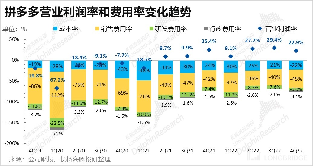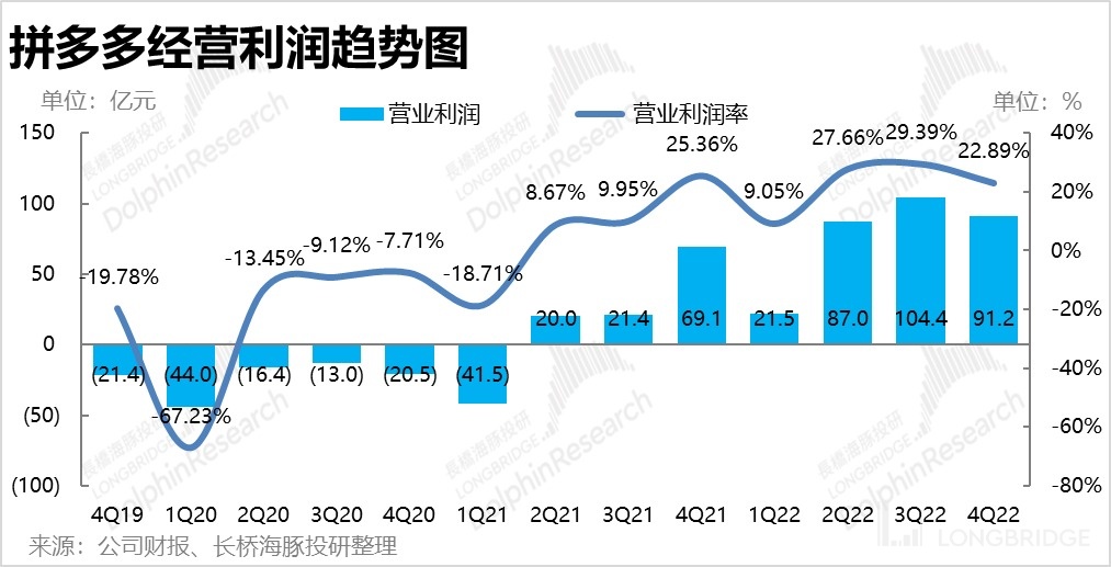 最終由於營收偏低,而費用卻在膨脹,拼多多本季的經營利潤為 91.2 億,同樣顯著低於一致預期的 104 億。利潤率也下降到 22.9%,甚至比去年同期的 25.4% 還低。