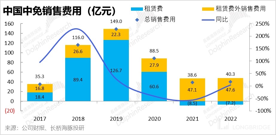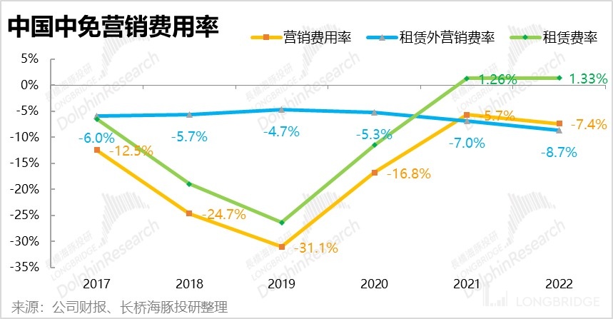 2022 年公司的營銷費用總支出為 40.3 億元,同比基本持平,不過考慮到 2022 年營收顯著下滑,因此營銷費用率還是同比由 5.7% 增加到了 7.4%。具體來看,去年公司由於和白雲等機場重籤租金合同,全年實際收入了 7.2 億的租金返還,和 21 的返還規模相當。