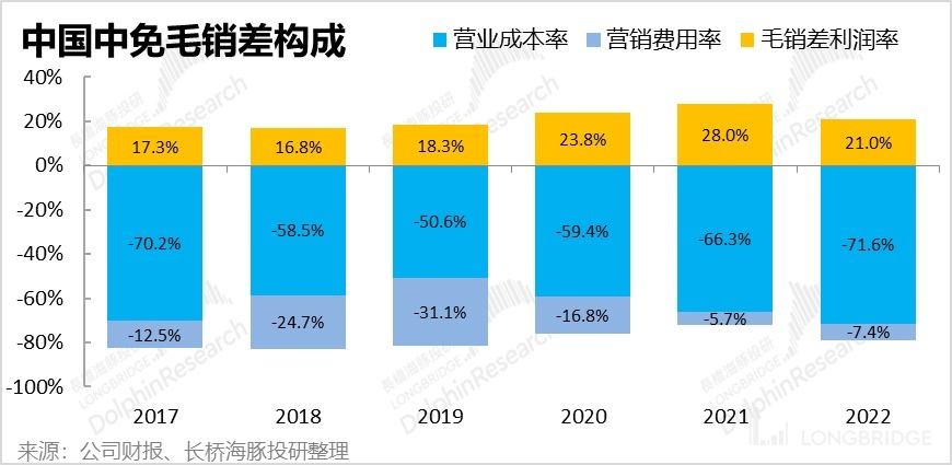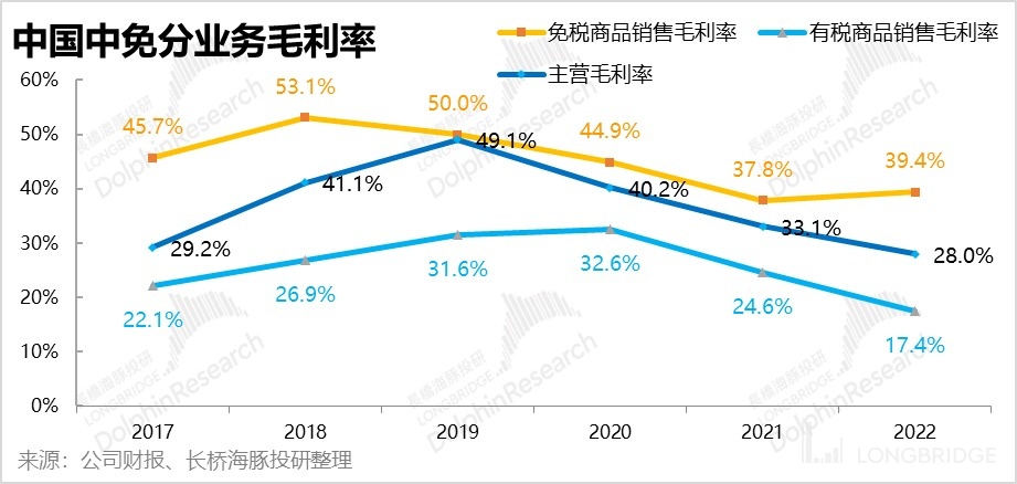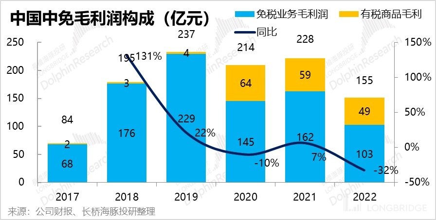 2. 毛利下滑全因有税,免税毛利實際觸底反彈:2022 年公司實現毛利潤 155 億元,同比下降 32%,受損程度還是高於營收。公司整體毛利率也從 2019 年最高點的 49% 下滑到今年的 28%,