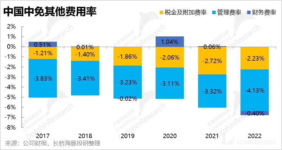 另外,中免在對費用的控制上也並不敏感。2022 年管理費用(包括研發支出)支出 22.5 億和 2021 年基本一致。同樣由於規模效應走低,費率也同比增加了近 0.8pct 到 4.1%。