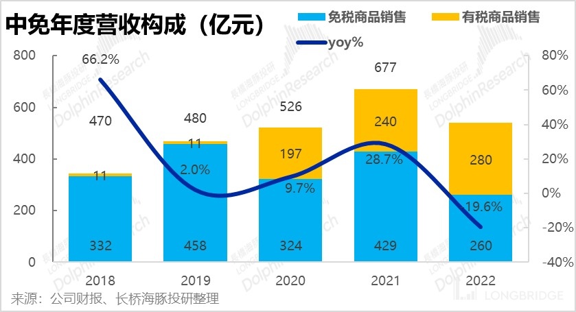 但也由於線上渠道大部分屬於需完税的有税銷售,公司雖稱作中國免税,但 2022 年內過半的收入實際由有税銷售貢獻。而營收結構上的巨大轉變,和隨之而來的影響也是本次財報中最值得關注的點。