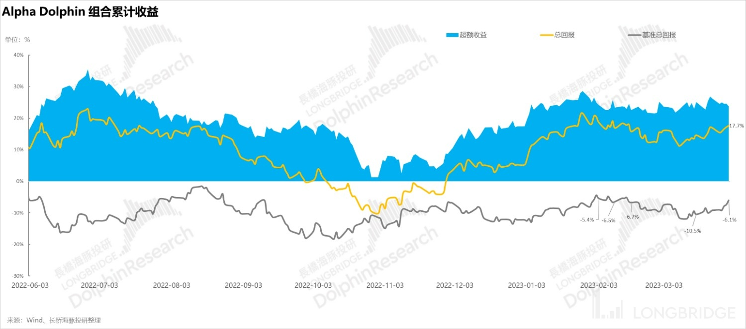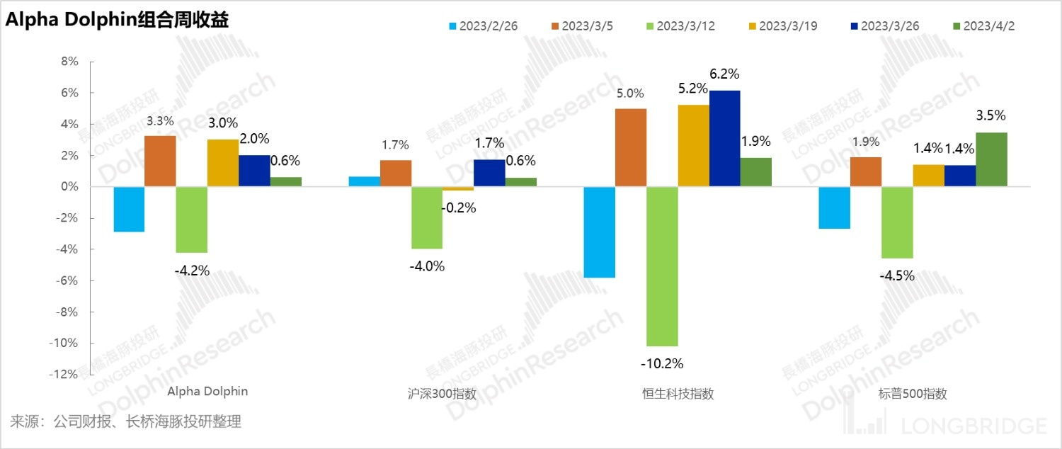 在 3 月 31 日周內,Alpha Dolphin 組合上行 0.6%,明顯低於標普 500(+3.5%)以及恒生科技 1.9%,與滬深 300 一致(0.6%)。