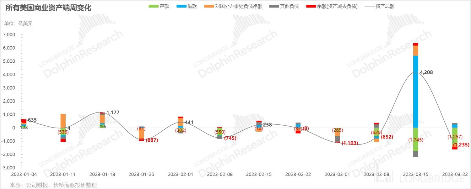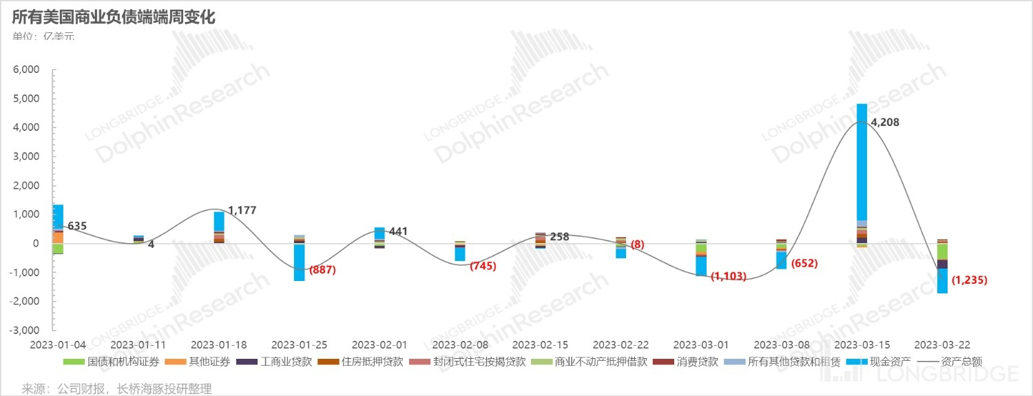 而海豚君上週在《美聯儲降息:就差一個美版餘額寶偷襲時刻?》説過,銀行業問題不等人,從截至到上上週 3 月 22 日的美國銀行業資產負債表情況來看,存款流出速度雖然有所緩解,但仍然不小,單週銀行業存款減少了 0.7%,尤其注意的是,如果是單純對小銀行不信任,存款從小銀行挪到大銀行,不至於導致整個銀行體系的存款減少。